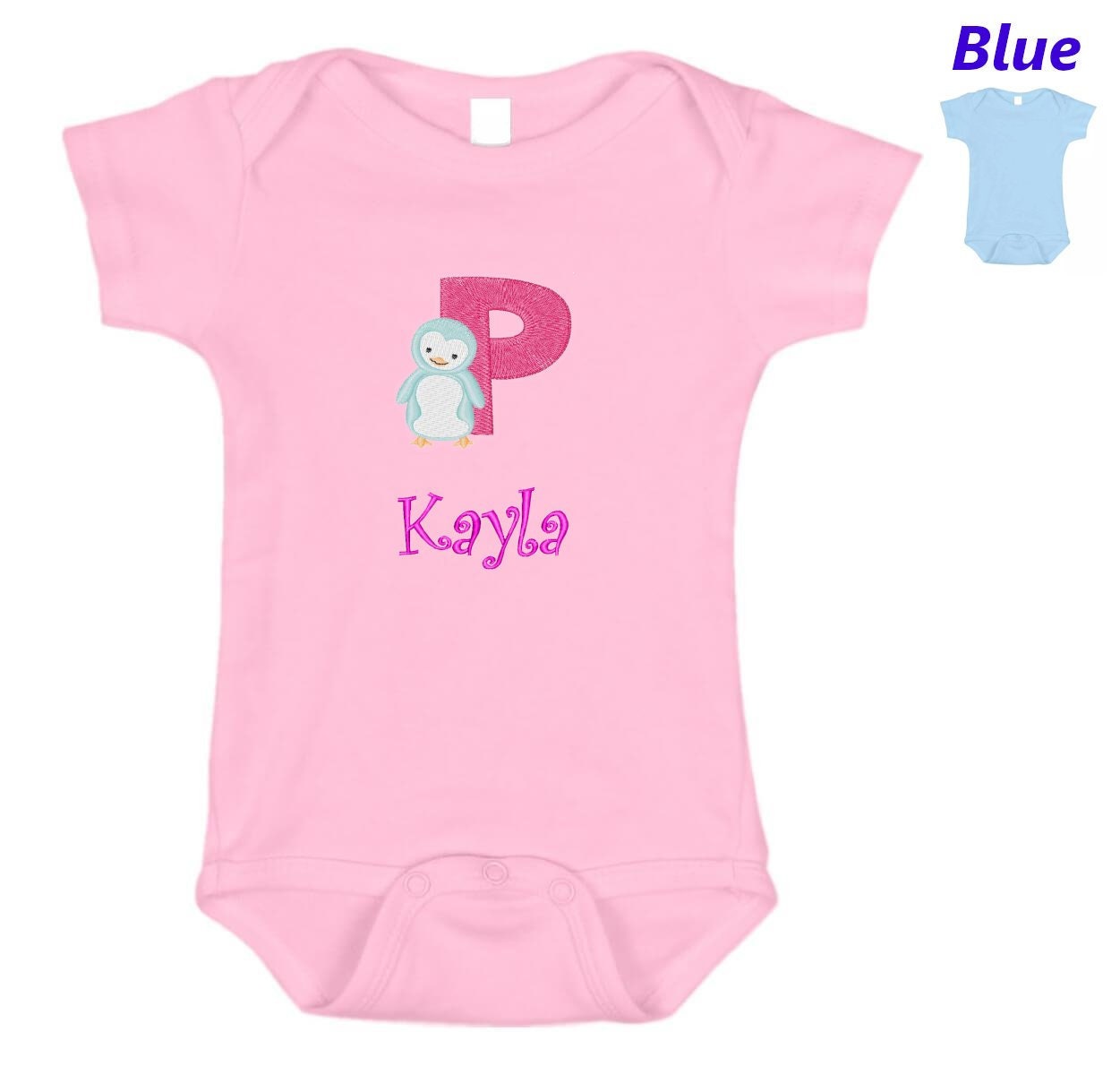 Personalized Baby Onesie Pink Blue Embroidered Letter P Penguin Newborn One Piece Body Suit Baby Shower Gift Monogrammed Your Baby's Name
