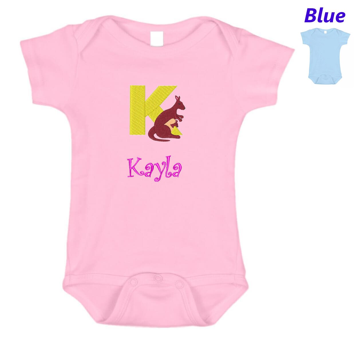Personalized Baby Onesie Pink Blue Embroidered Letter K Kangaroo Newborn One Piece Body Suit Baby Shower Gift Monogrammed Your Baby's Name