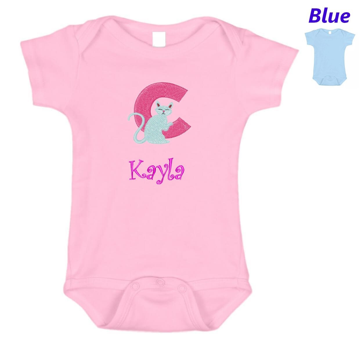 Personalized Baby Onesie Pink Blue Embroidered Letter C Cat Newborn One Piece Body Suit Baby Shower Gift Monogrammed with Your Baby's Name
