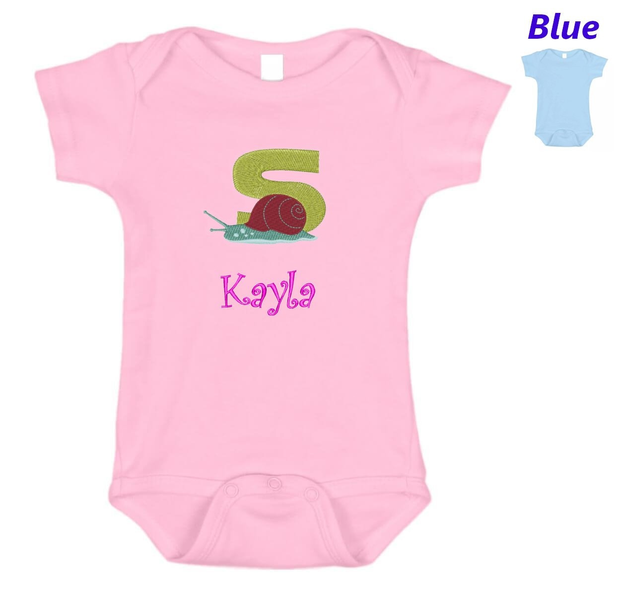 Personalized Baby Onesie Pink Blue Embroidered Letter S Snail Newborn One Piece Body Suit Baby Shower Gift Monogrammed Your Baby's Name