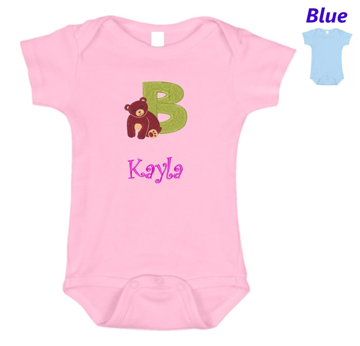Personalized Baby Onesie Pink Blue Embroidered Letter B Bear Newborn One Piece Body Suit Baby Shower Gift Monogrammed with Your Baby's Name