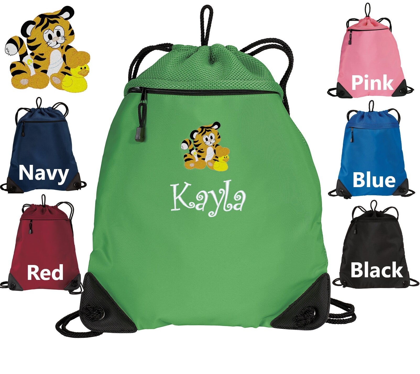 Personalized Kids Tiger Cinch Pack, Drawstring Gym School PE Pool Backpack, Embroidered Tiger, Monogrammed Custom Name, Kids Gift