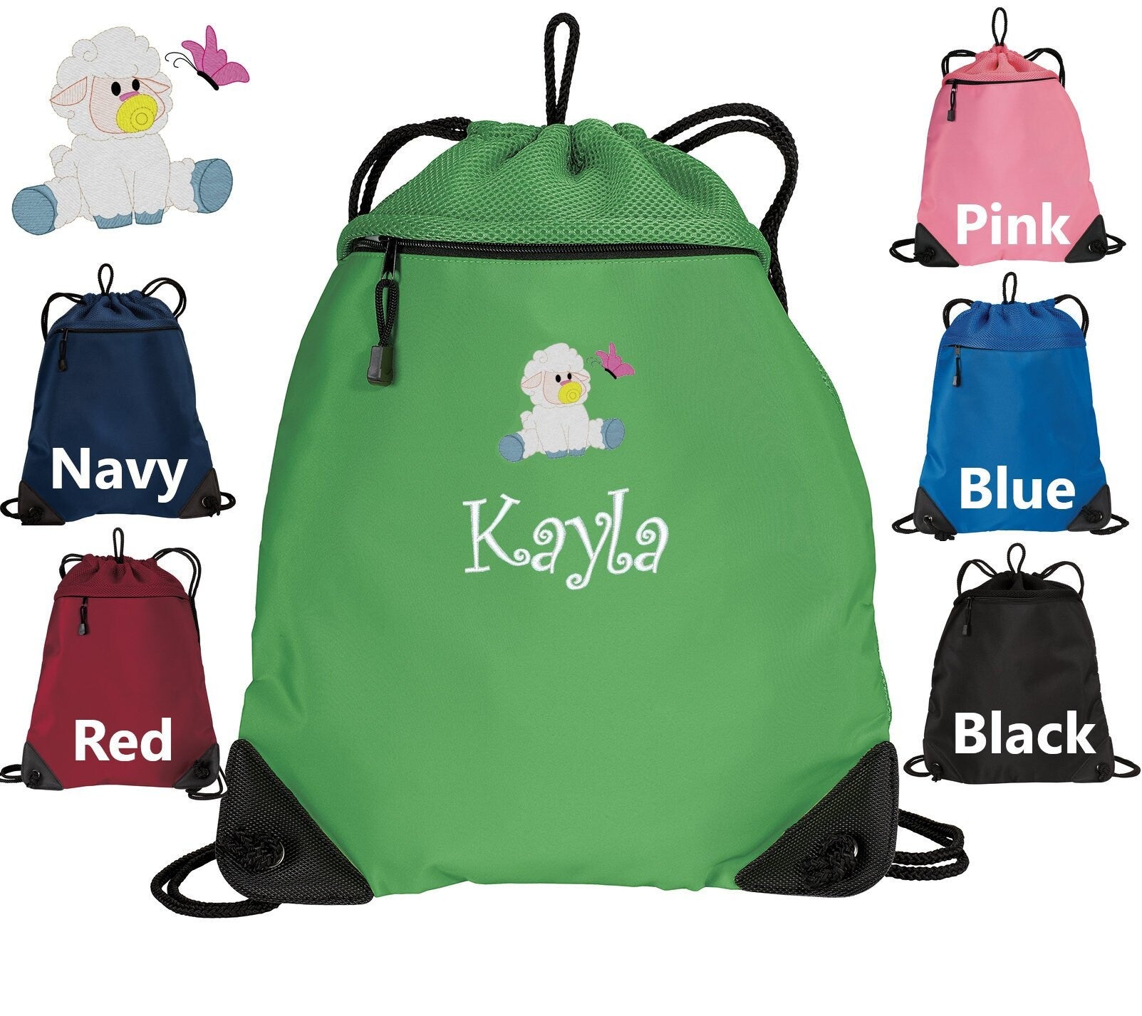 Personalized Kids Cinch Pack, Drawstring Gym School PE Pool Backpack, Embroidered Lamb Sheep, Custom Name, Kids Gift