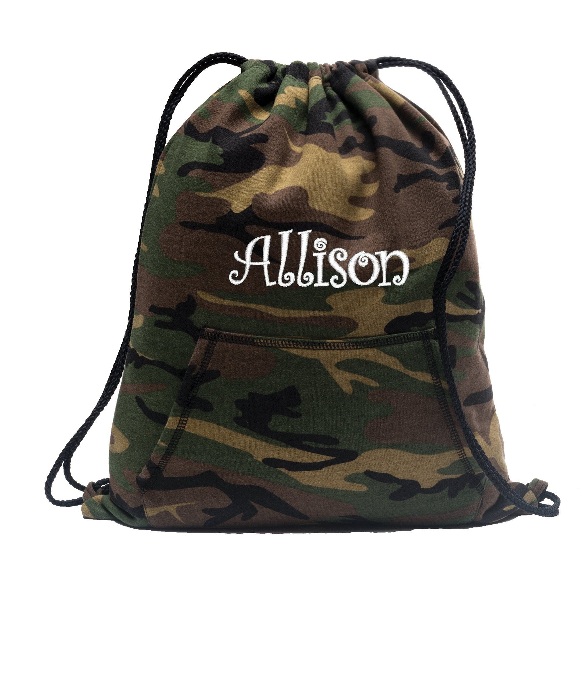 Personalized Camouflage Cinch Pack, Sweatshirt Fleece, Drawstring Gym School PE Backpack, Embroidered Monogrammed Custom Name, School Gift