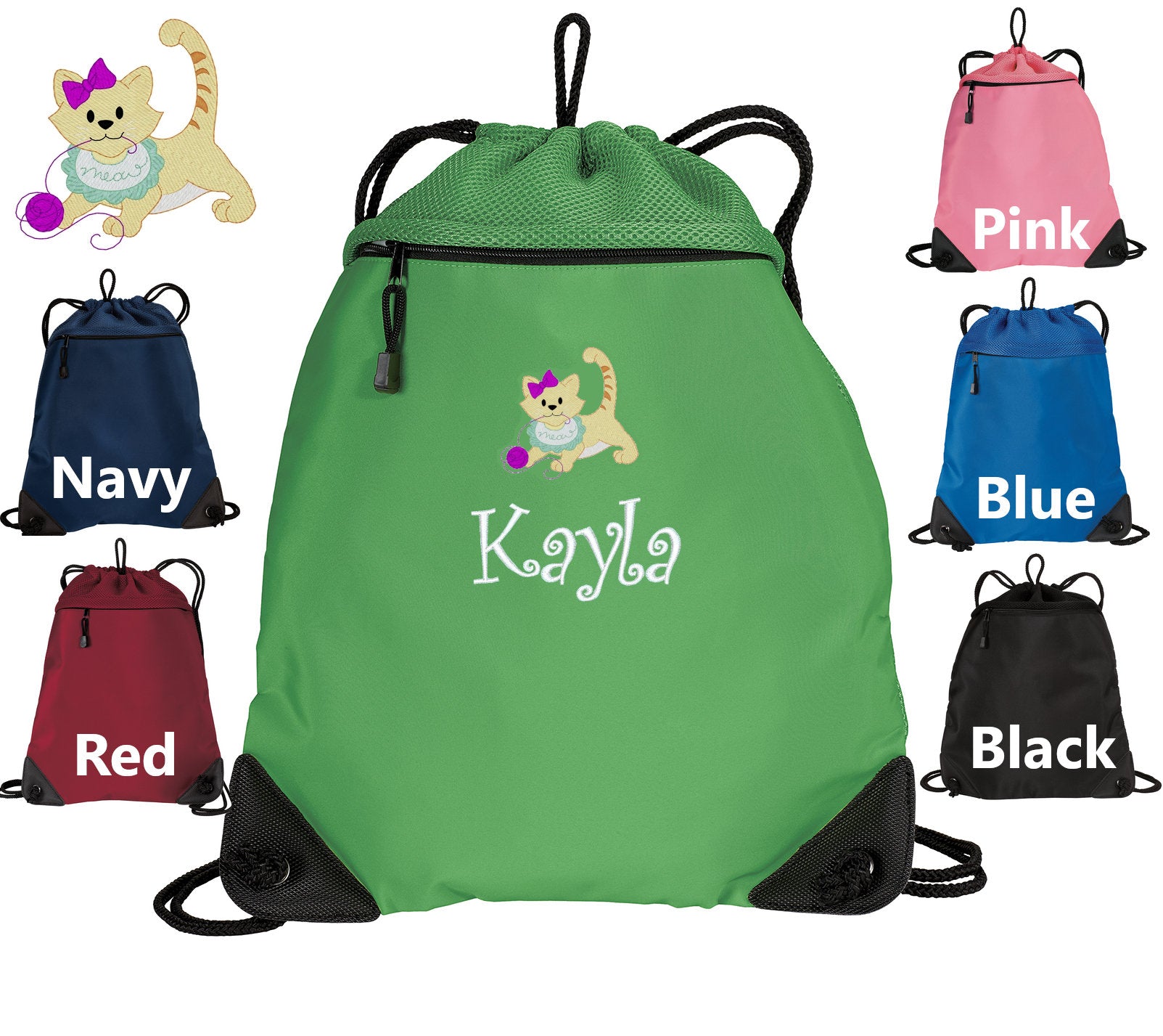 Personalized Kids Cat Cinch Pack, Drawstring Gym School PE Pool Backpack, Embroidered Kitty Cat, Custom Name, Kids Gift