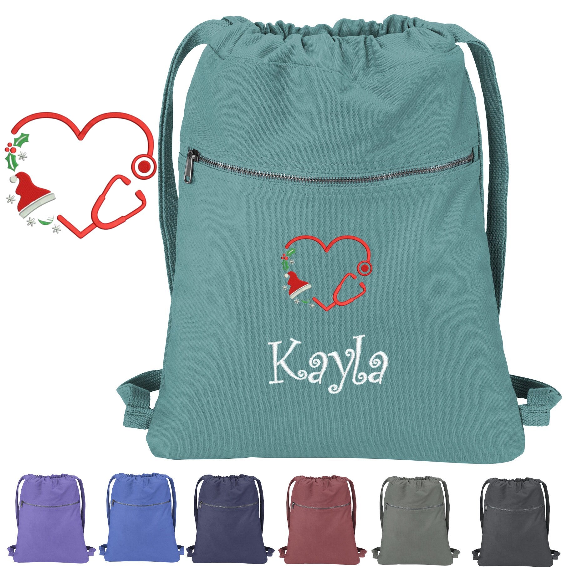 Personalized Christmas Nurse Cinch Pack Gift, Embroidered Heart Scope Design, Drawstring School, Pool Backpack, Monogrammed Custom Name