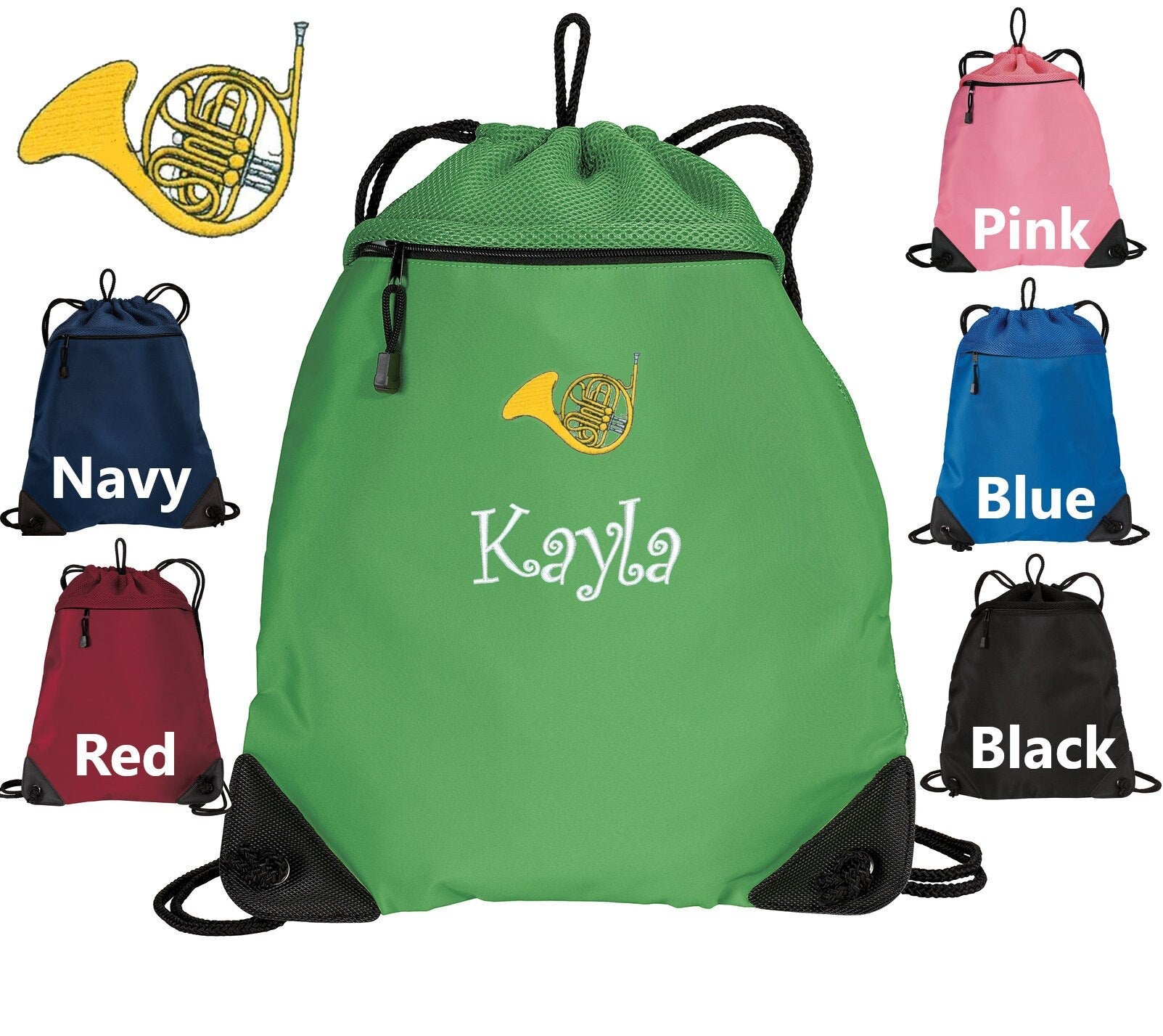 Personalized Kids Cinch Pack Embroidered French Horn Design, Drawstring Gym School PE Pool Backpack, Monogrammed Custom Name, Kids Band Gift