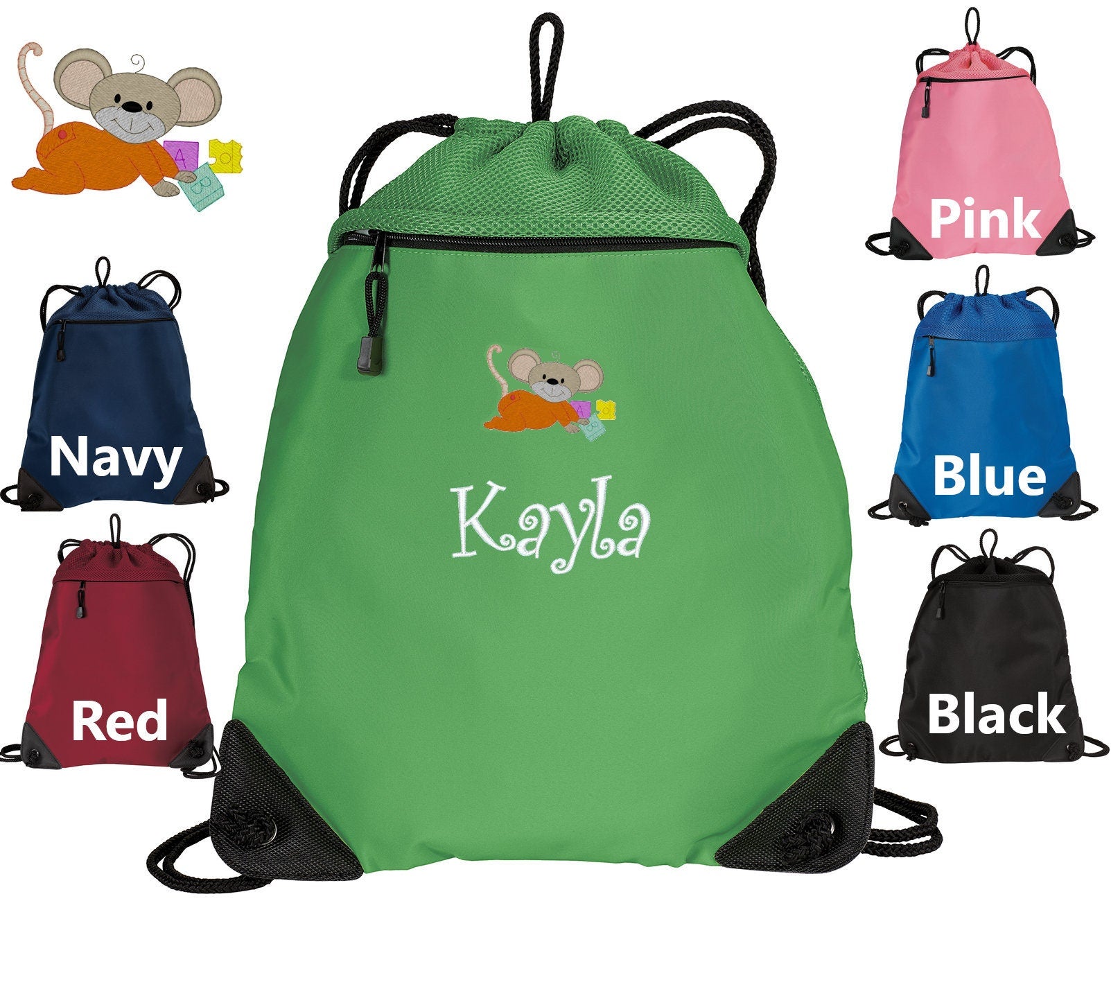 Personalized Kids Cinch Pack, Drawstring Gym School PE Pool Backpack, Embroidered Mouse, Custom Name, Kids Gift