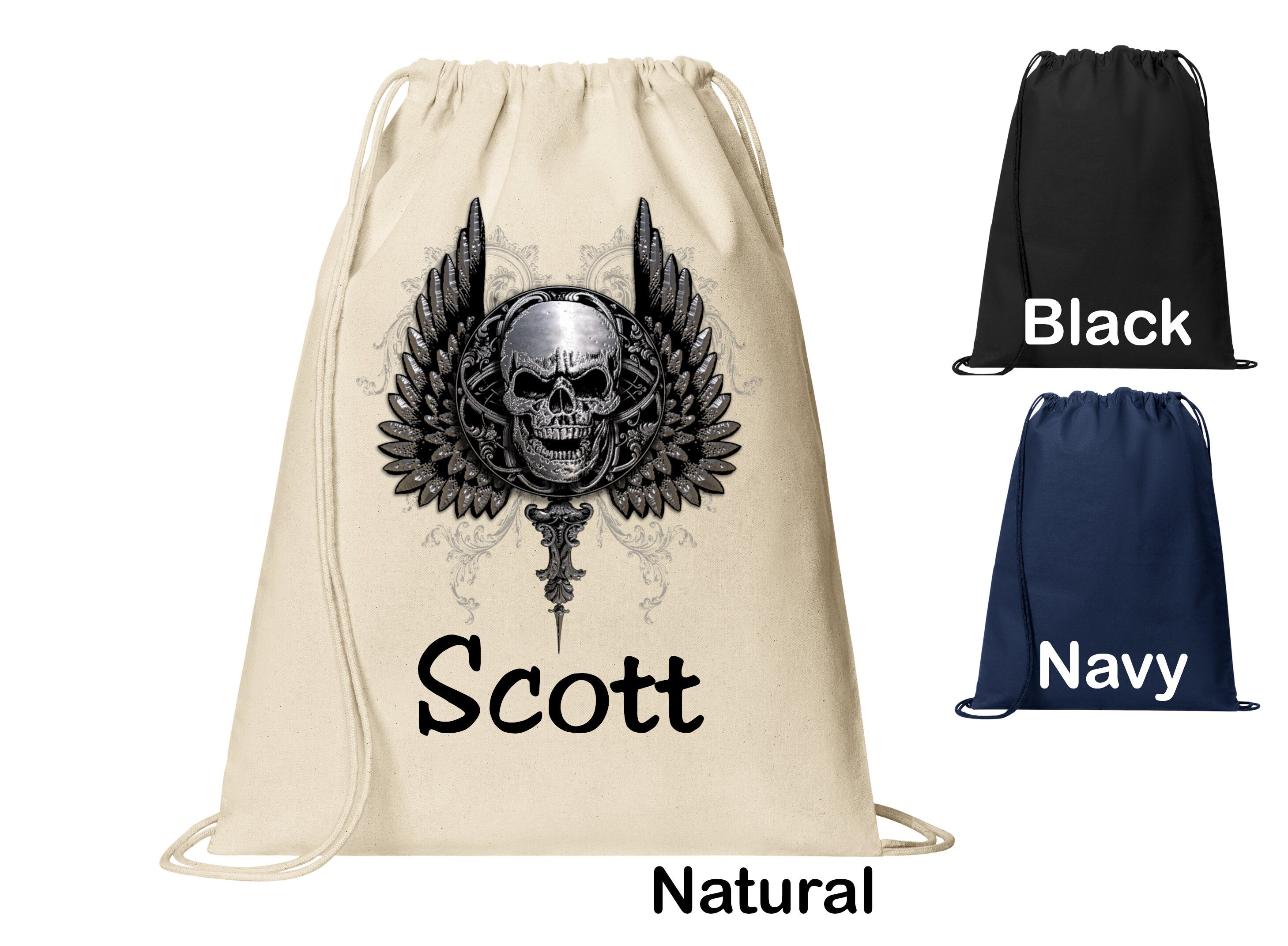 Personalized Goth Skull Wings Biker Design Cinch Pack, Drawstring Gym School Pool Backpack, Printed Monogrammed Custom Name, Perfect Gift