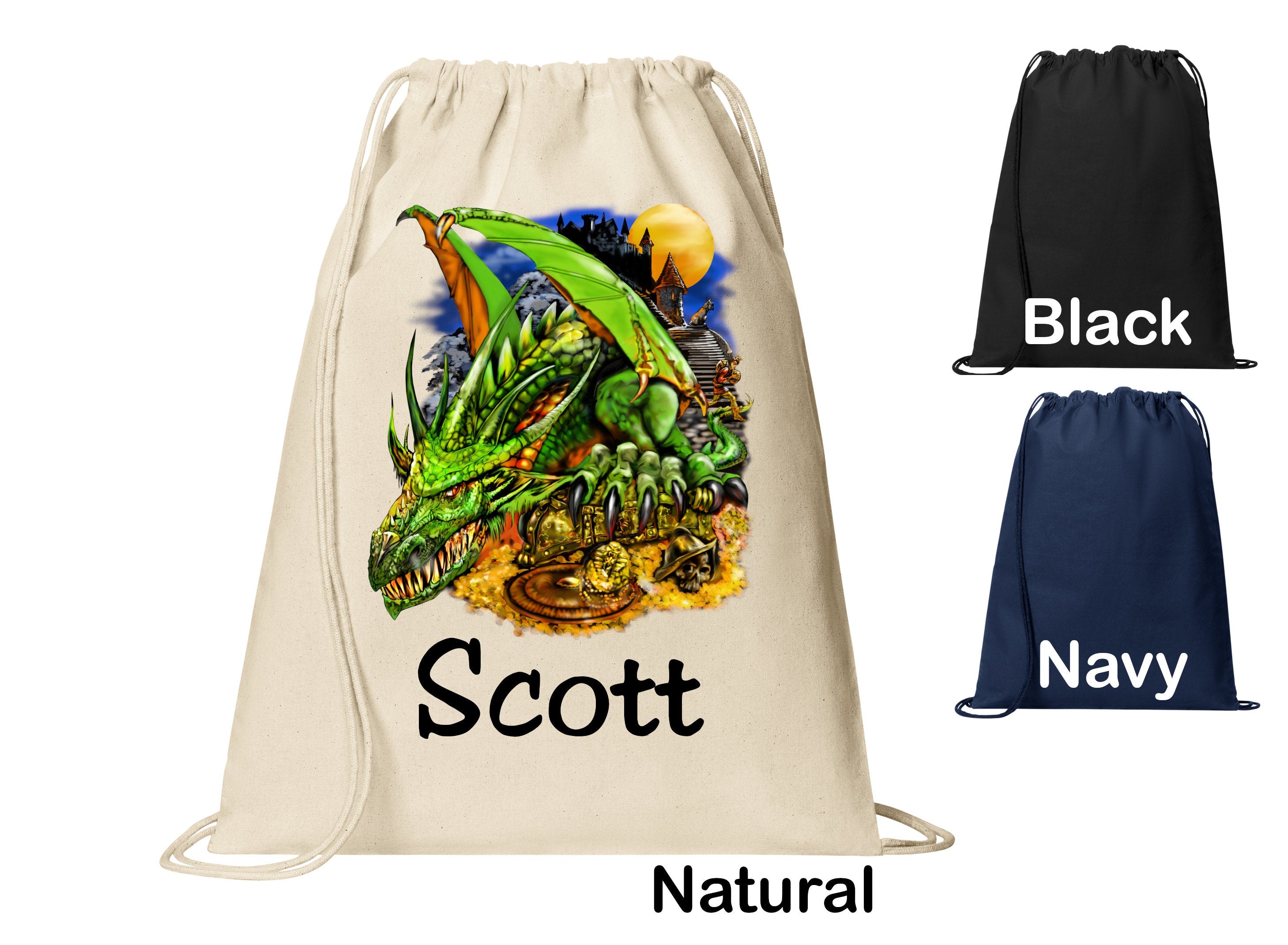 Personalized Green Dragon Castle Fantasy Cinch Pack, Drawstring Gym School Pool Backpack, Printed Monogrammed Custom Name, Perfect Gift