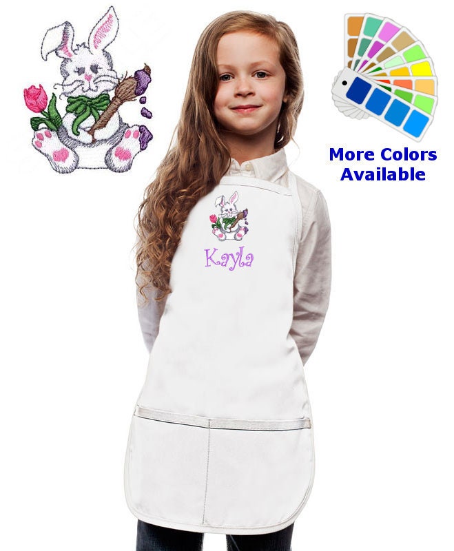 Personalized Kids Easter Apron with Easter Bunny Flower Paint Brush Embroidery Design