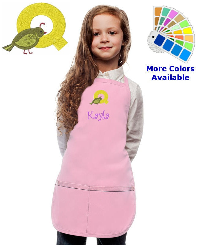 Personalized Kids Apron with Animal Alphabet Letter Q Quail Embroidery Design, Monogrammed Art Smock, Childrens Apron, Cooking Gift