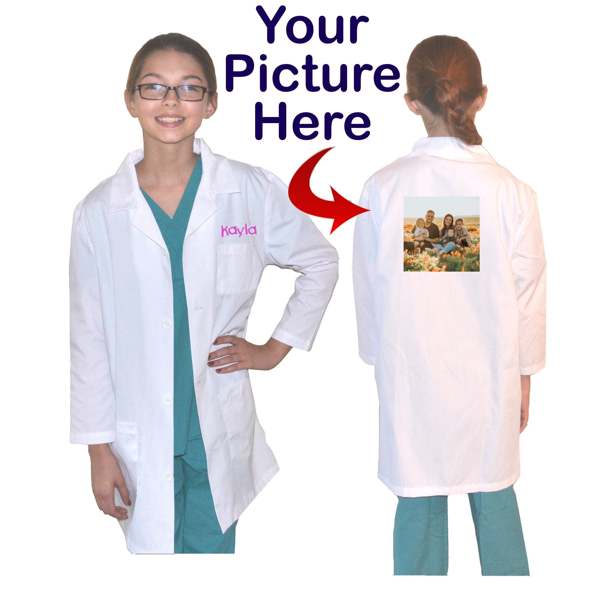 Personalized Kids Doctor Lab Coat with Large Printed Picture on Back, School, Science, Nurse, Veterinarian