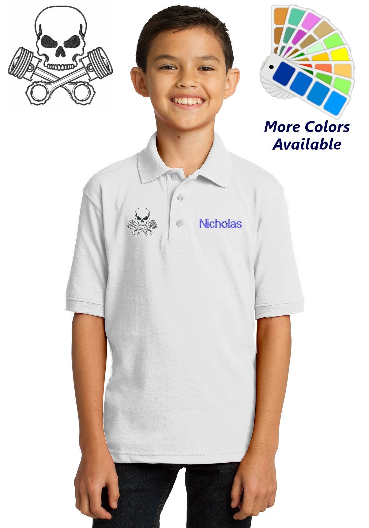 Personalized Kids Polo Shirt Embroidered Mechanics Skull and Pistons Monogrammed with a Name or Text of Your Choice