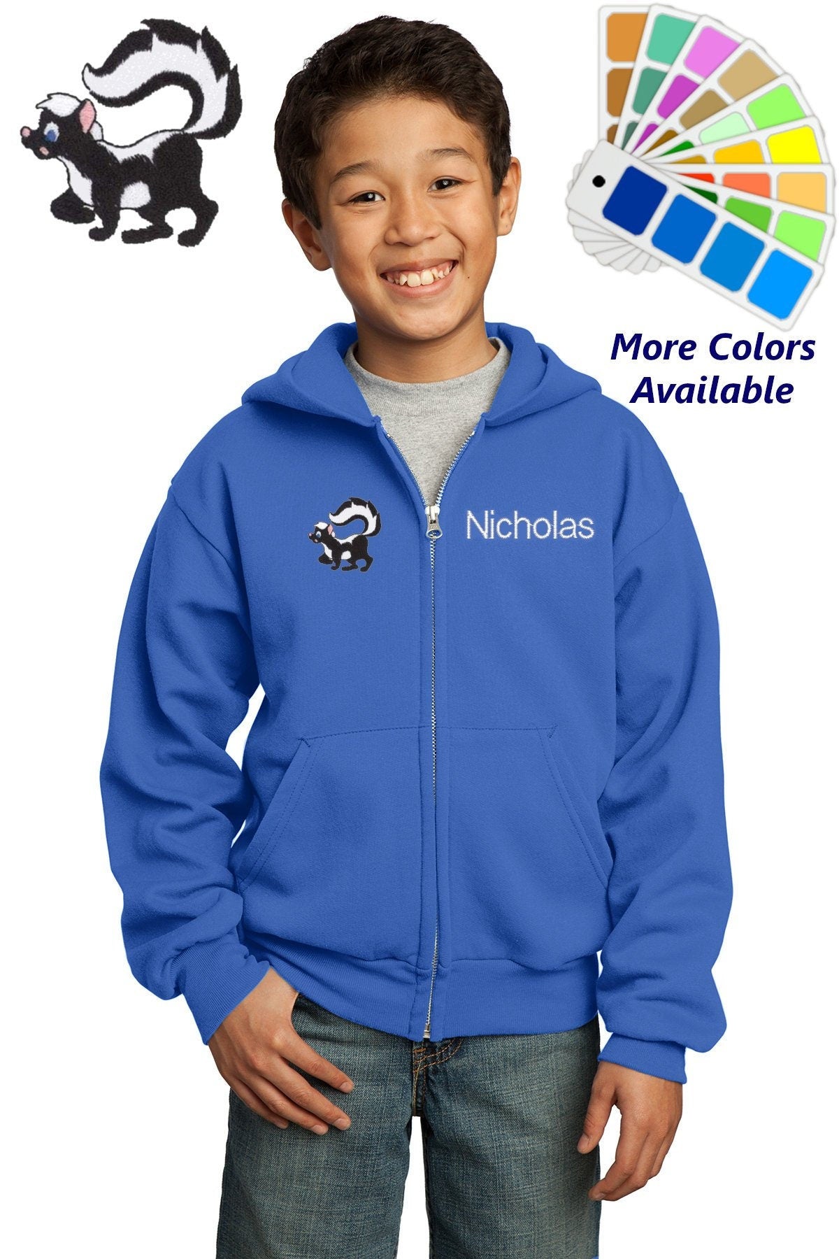 Personalized Kids Hoodie Sweatshirt Zipper Embroidered Skunk Design with a Name of Your Choice