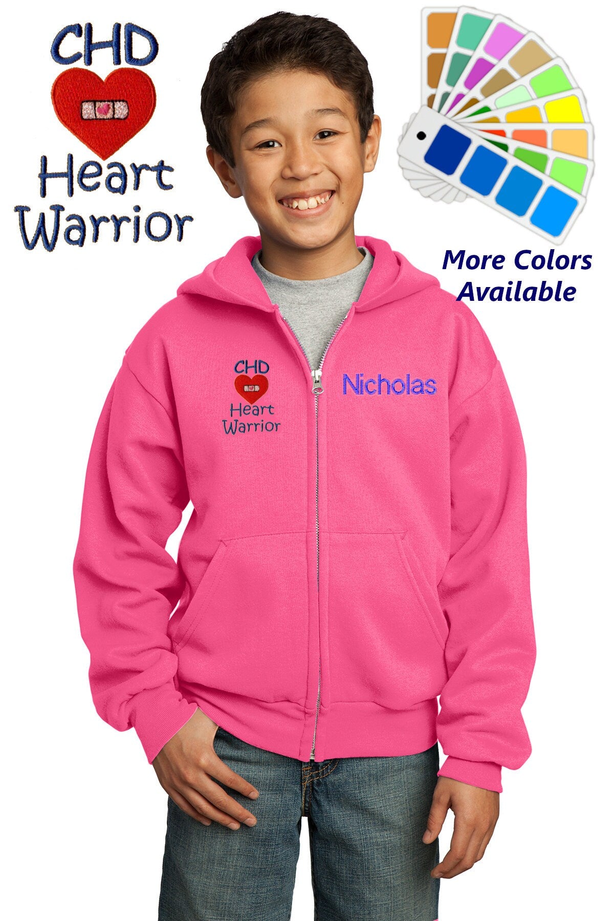Personalized Kids Hoodie Sweatshirt Zipper Embroidered CHD Heart Warrior Design with a Name of Your Choice