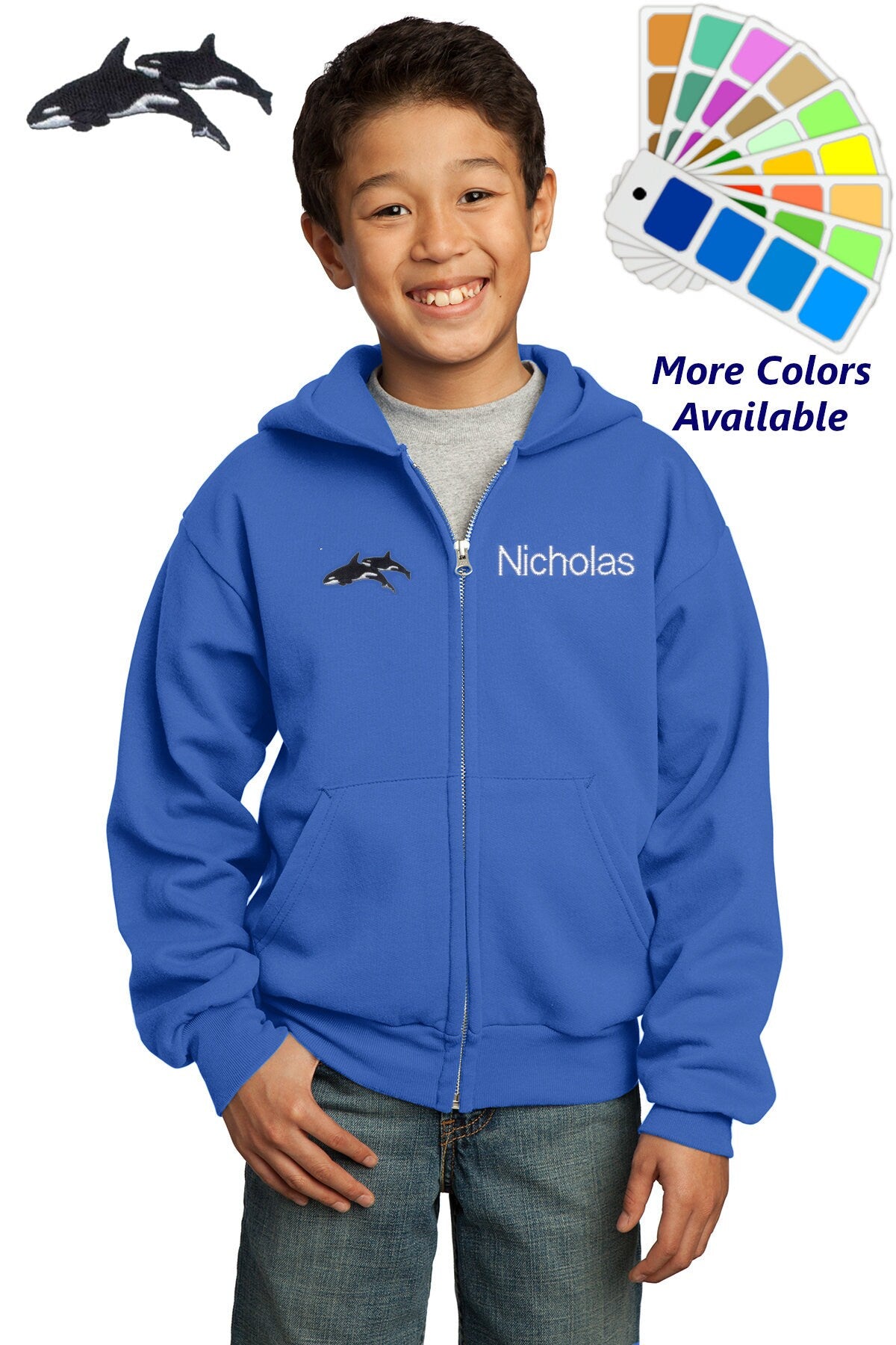 Personalized Kids Hoodie Sweatshirt Zipper Embroidered Killer Whales Design with a Name of Your Choice
