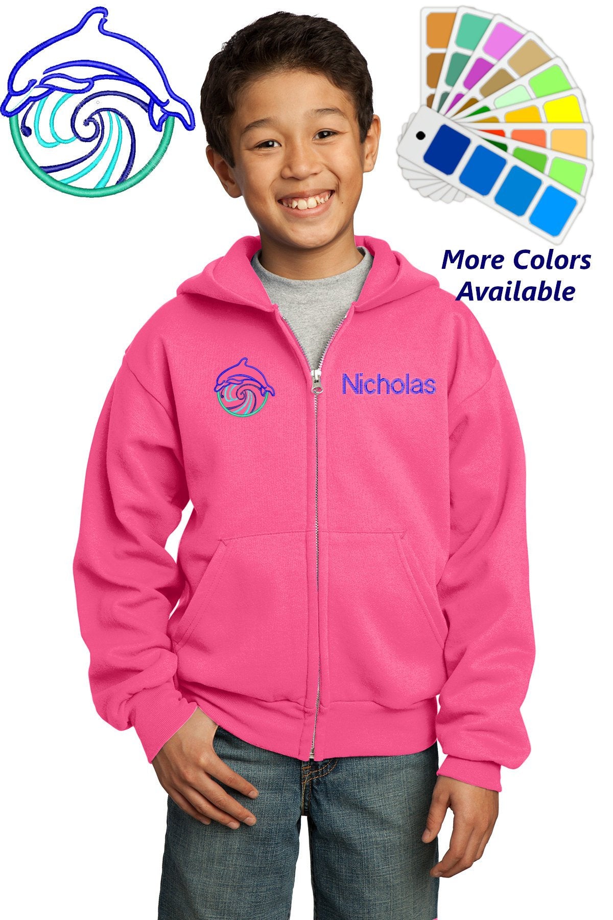 Personalized Kids Hoodie Sweatshirt Zipper Embroidered Dolphin Wave Design with a Name of Your Choice