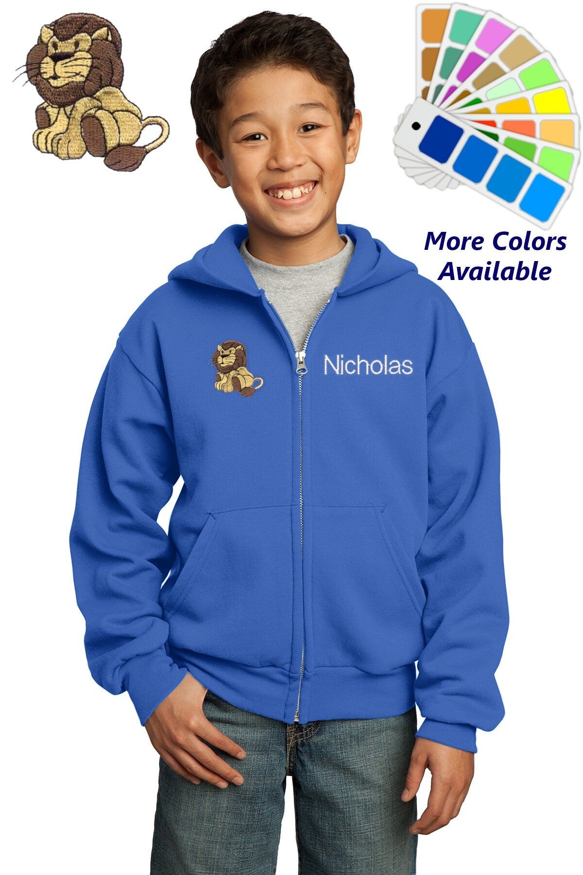 Personalized Kids Hoodie Sweatshirt Zipper Embroidered Lion Design with a Name of Your Choice