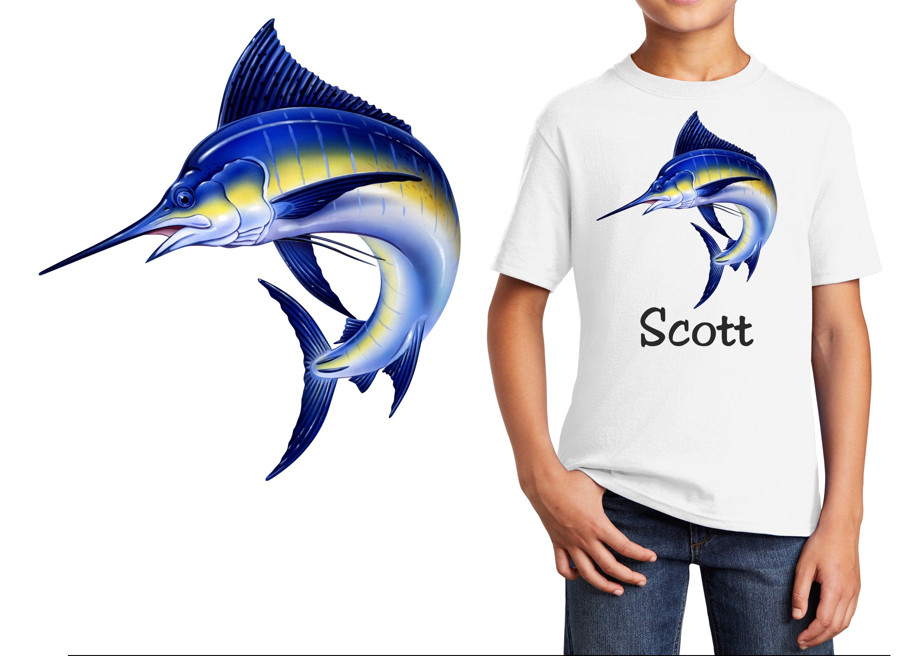 Personalized Kids T-Shirt Blue Marlin Fish Design, Fishing T-Shirt, Cotton, Low Price Inexpensive Tee Shirt, Student Gift, School Gift