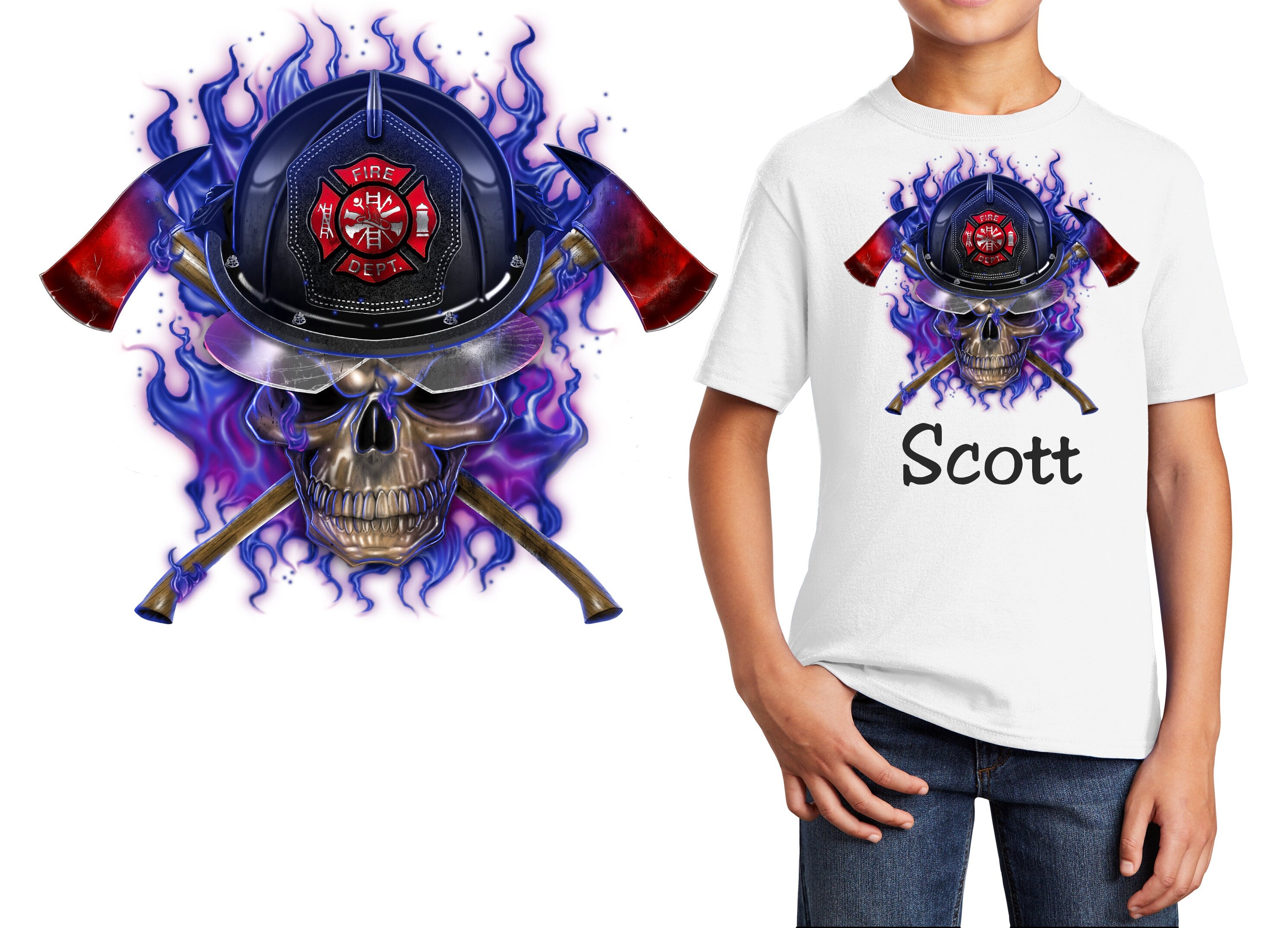Personalized Kids T-Shirt Firefighter Skull Axe Design, T-Shirt, Colorful, Cotton, Low Price Inexpensive Tee Shirt, Student School Gift