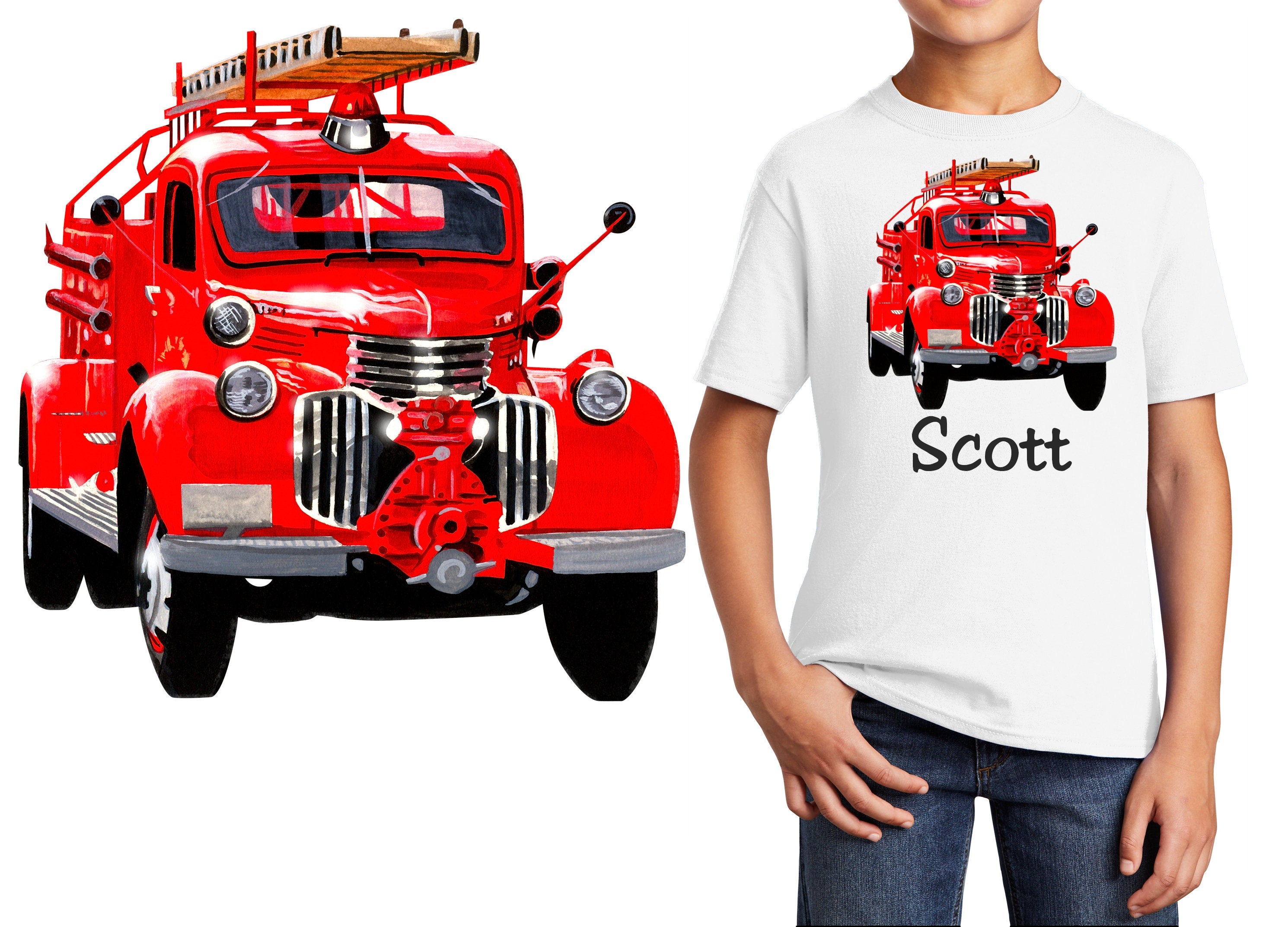 Personalized Kids T-Shirt Fire Engine Truck Design, T-Shirt, Colorful, Cotton, Low Price Inexpensive Tee Shirt, Student Gift, School Gift