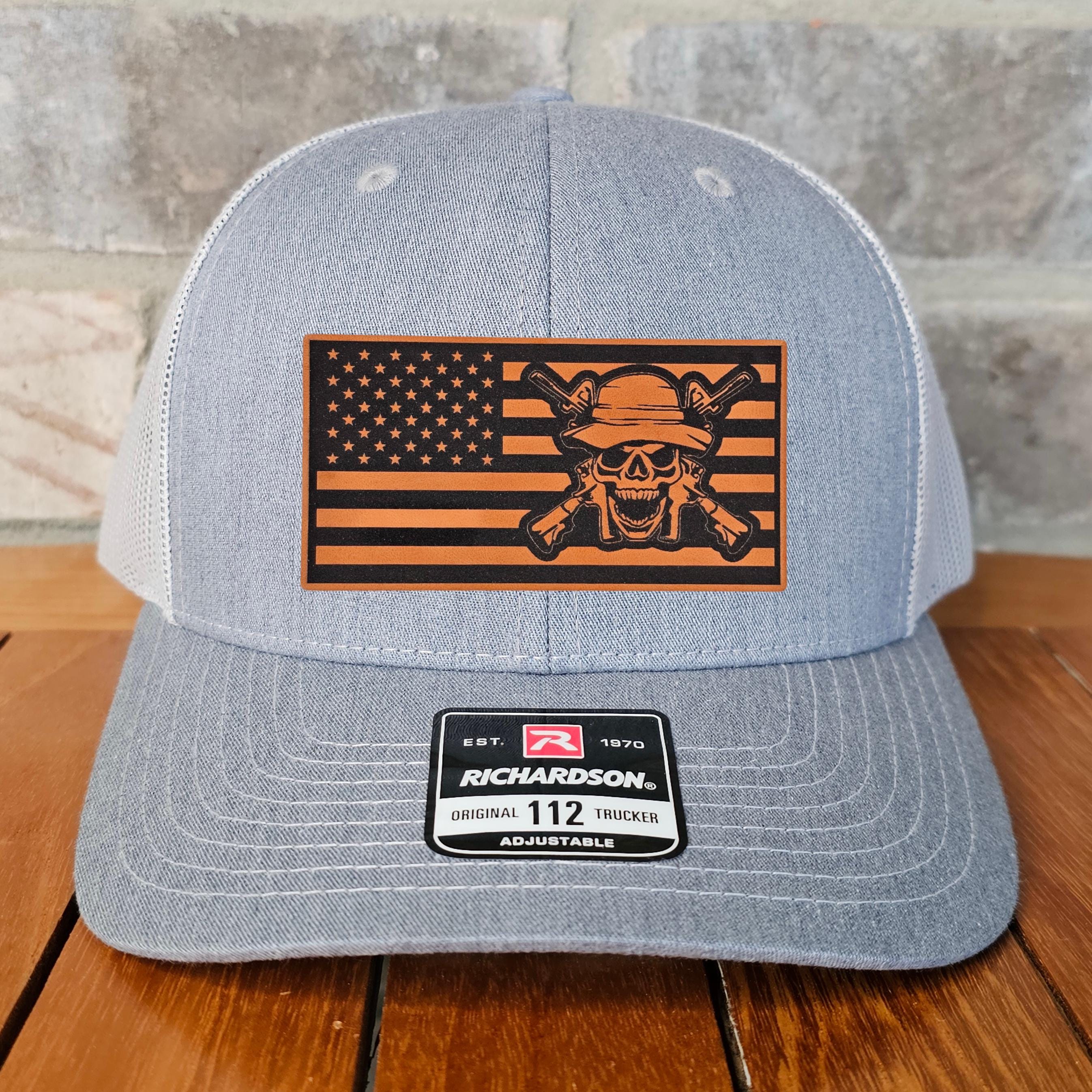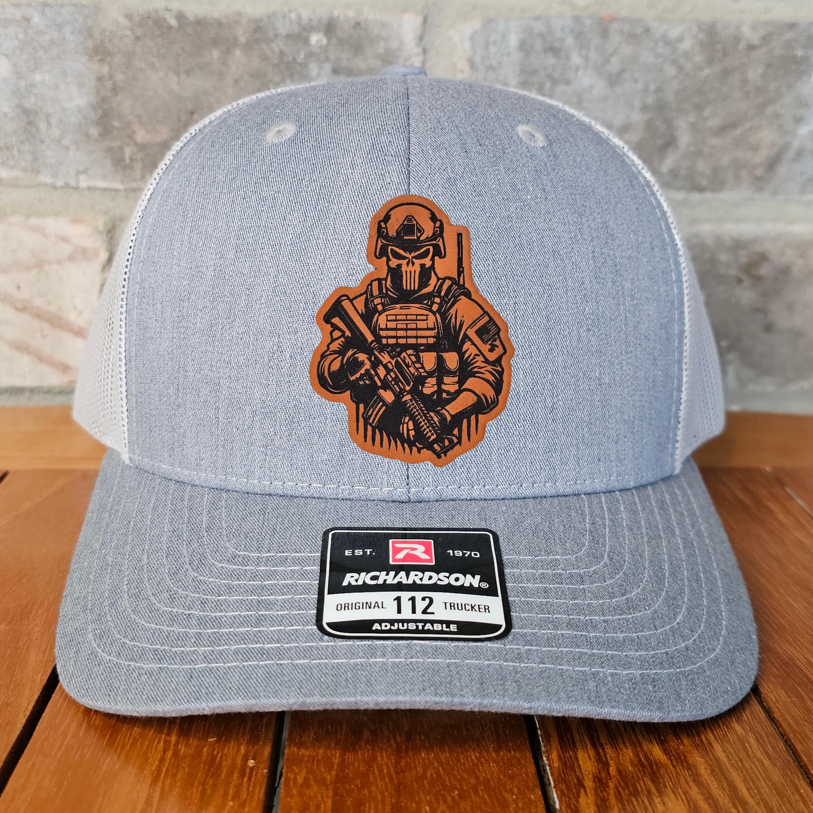 Soldier Skull Leather Patch Trucker Hat, Richardson 112, Patriotic Hat, Military Gift, Dad Gift, Husband Gift, Laser Engraved
