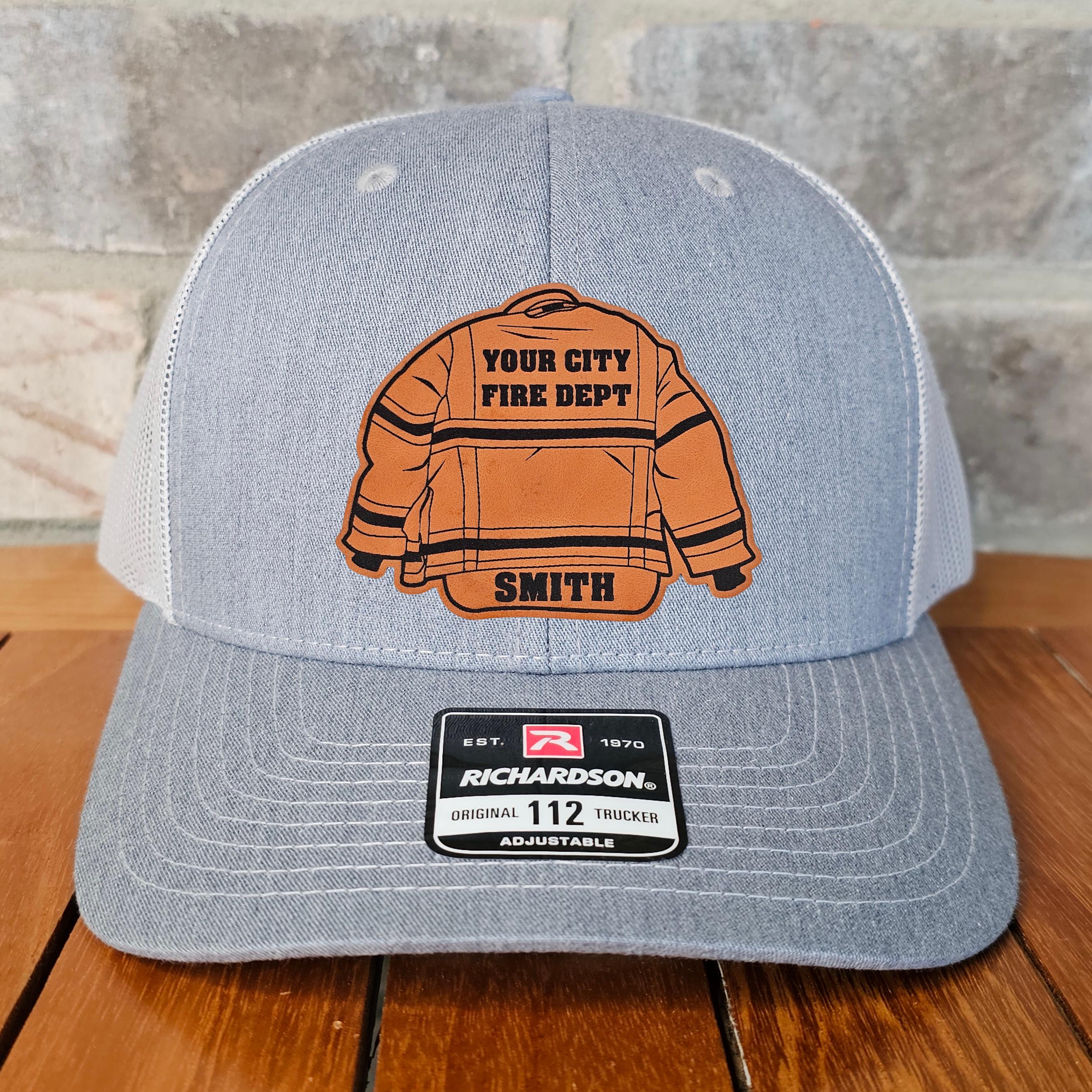 Personalized Firefighter Leather Patch Trucker Hat with Name, Richardson 112, Fireman Hat, Husband Gift, Station Gift, Laser Engraved