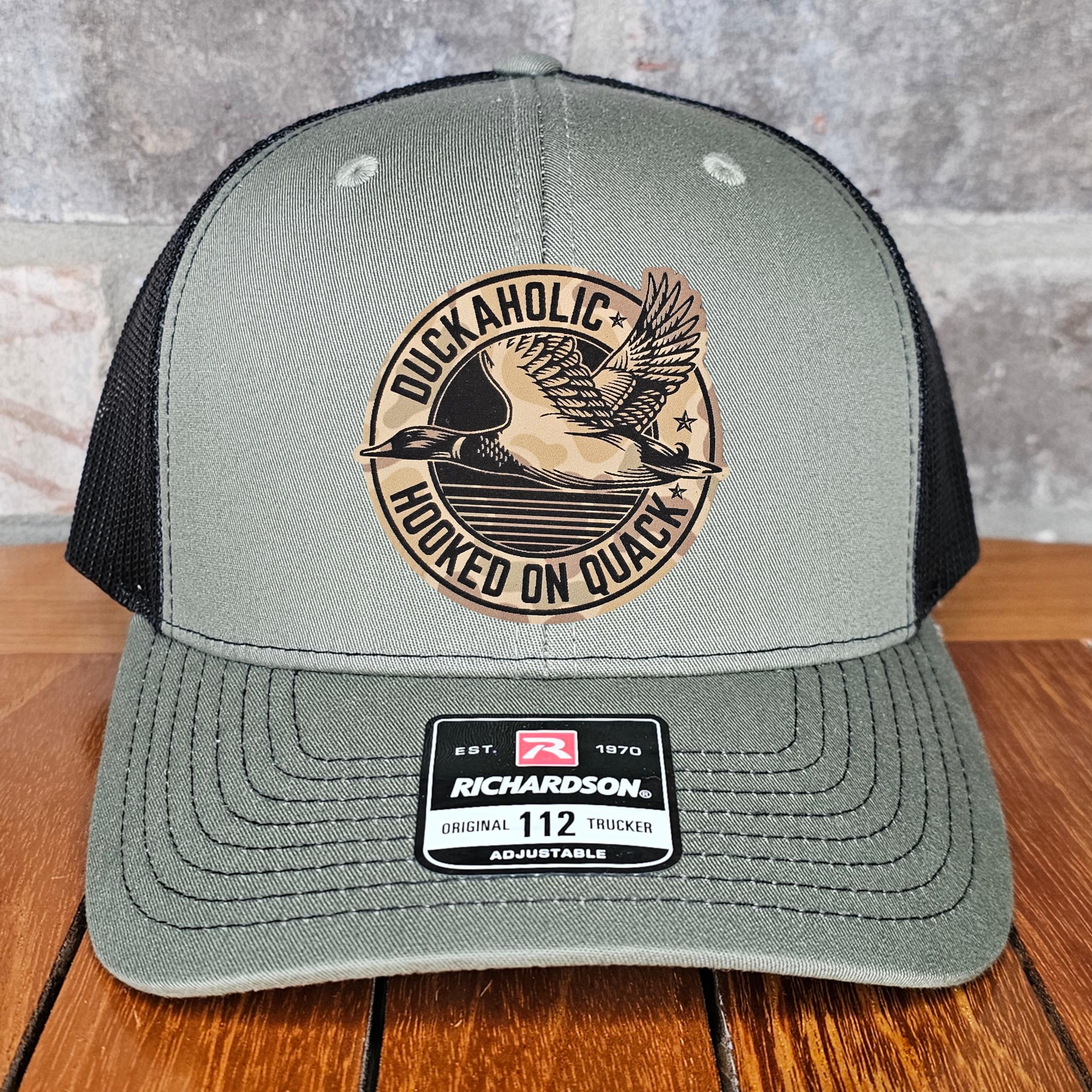 Duck Hunter Leather Patch Trucker Hat, Duckaholic Hooked on Quack, Richardson 112, Hunter Hat, Funny Dad Gift, Sportsman Gift,Laser Engraved