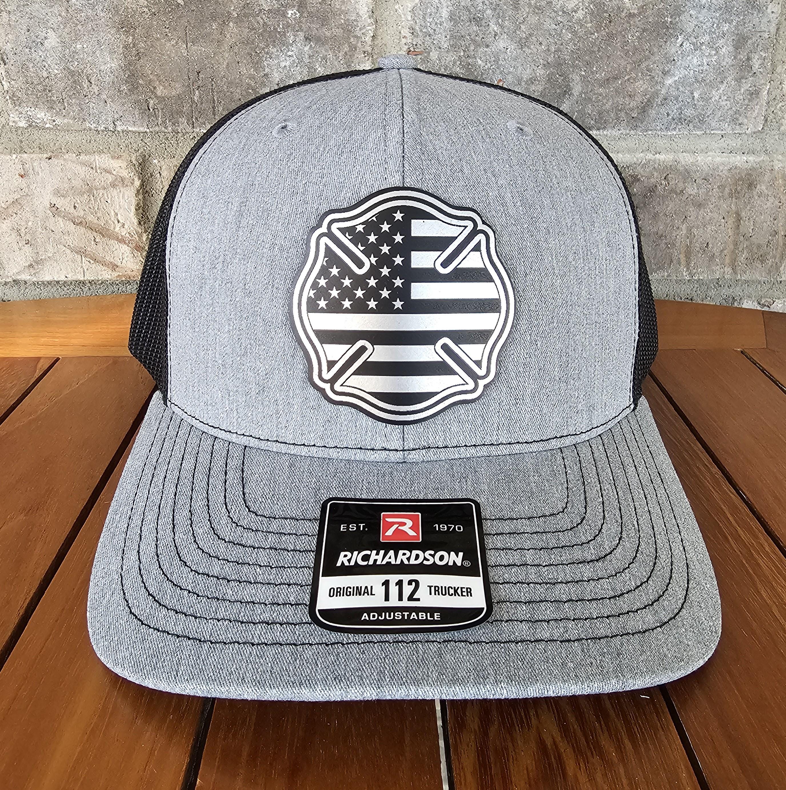 Firefighter Leather Patch Trucker Hat with Black Maltese Cross, Richardson 112, Fireman Hat, Dad Husband Gift, Station Gift, Laser Engraved