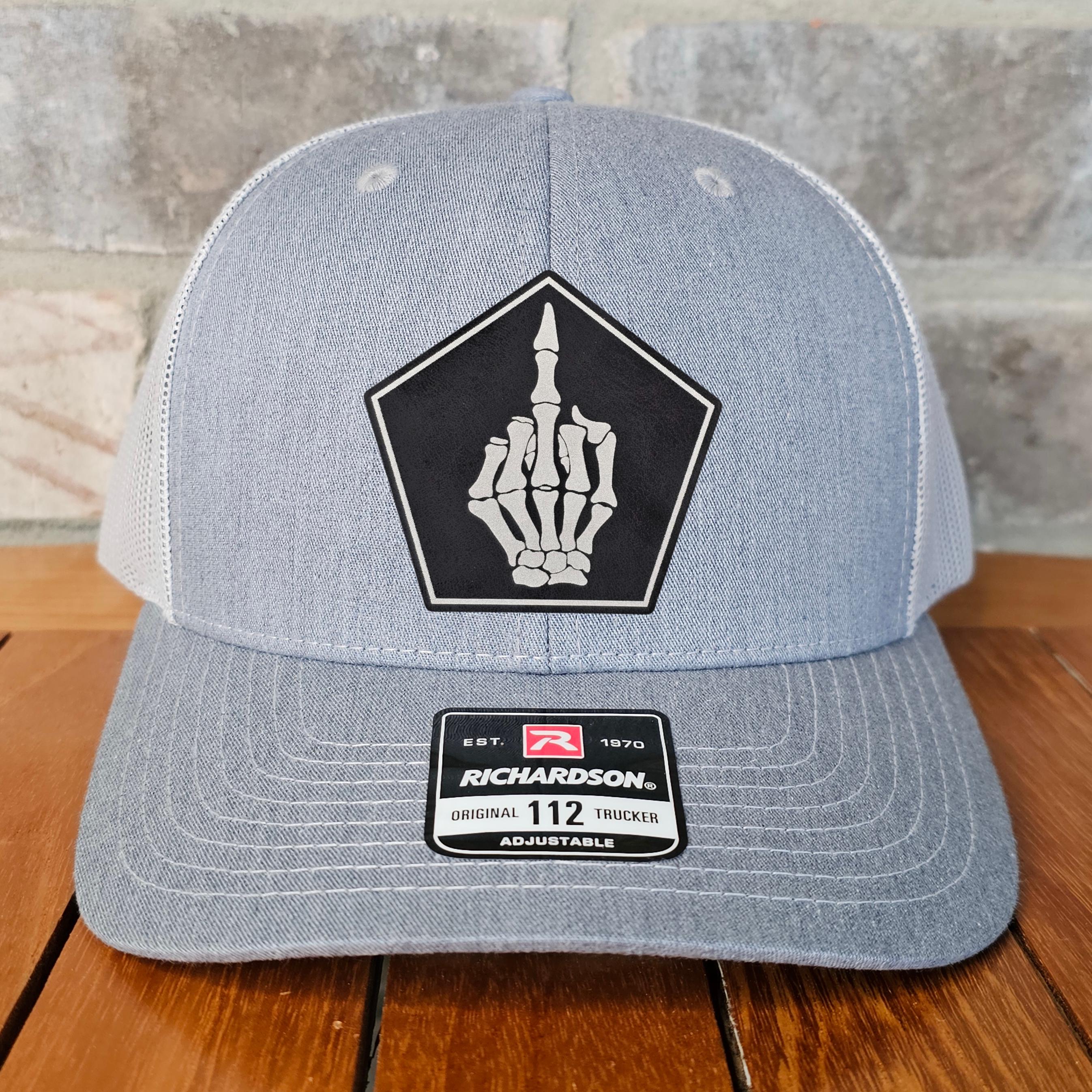 Skeleton Leather Patch Trucker Hat, Richardson 112, Middle Finger Cap, Halloween Hat, Antisocial, F You, Laser Engraved