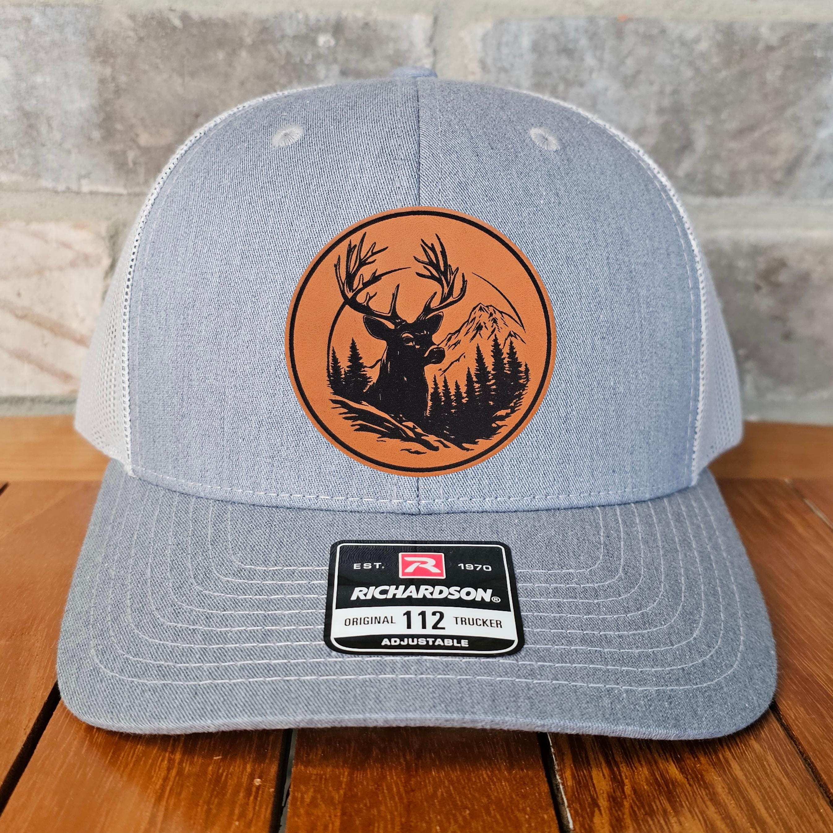 Deer Leather Patch Trucker Hat, Richardson 112, Mountain Deer Hunter Hat, Dad Gift, Husband Gift, Sportsman Gift, Laser Engraved