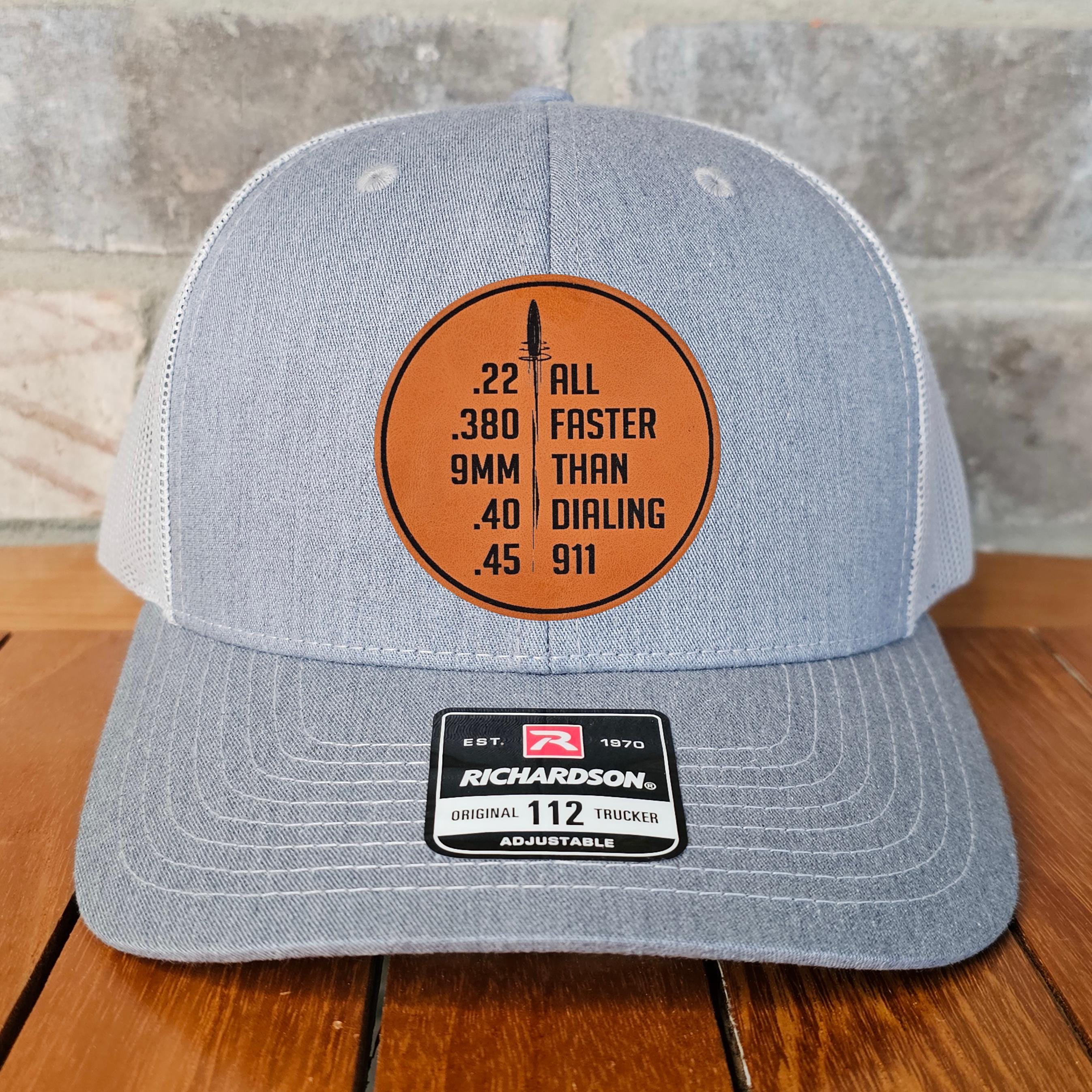 Faster Than 911 Leather Patch Trucker Hat, Richardson 112, Gun Rights Cap, Second Amendment, Dad Gift, Husband Gift, Laser Engraved