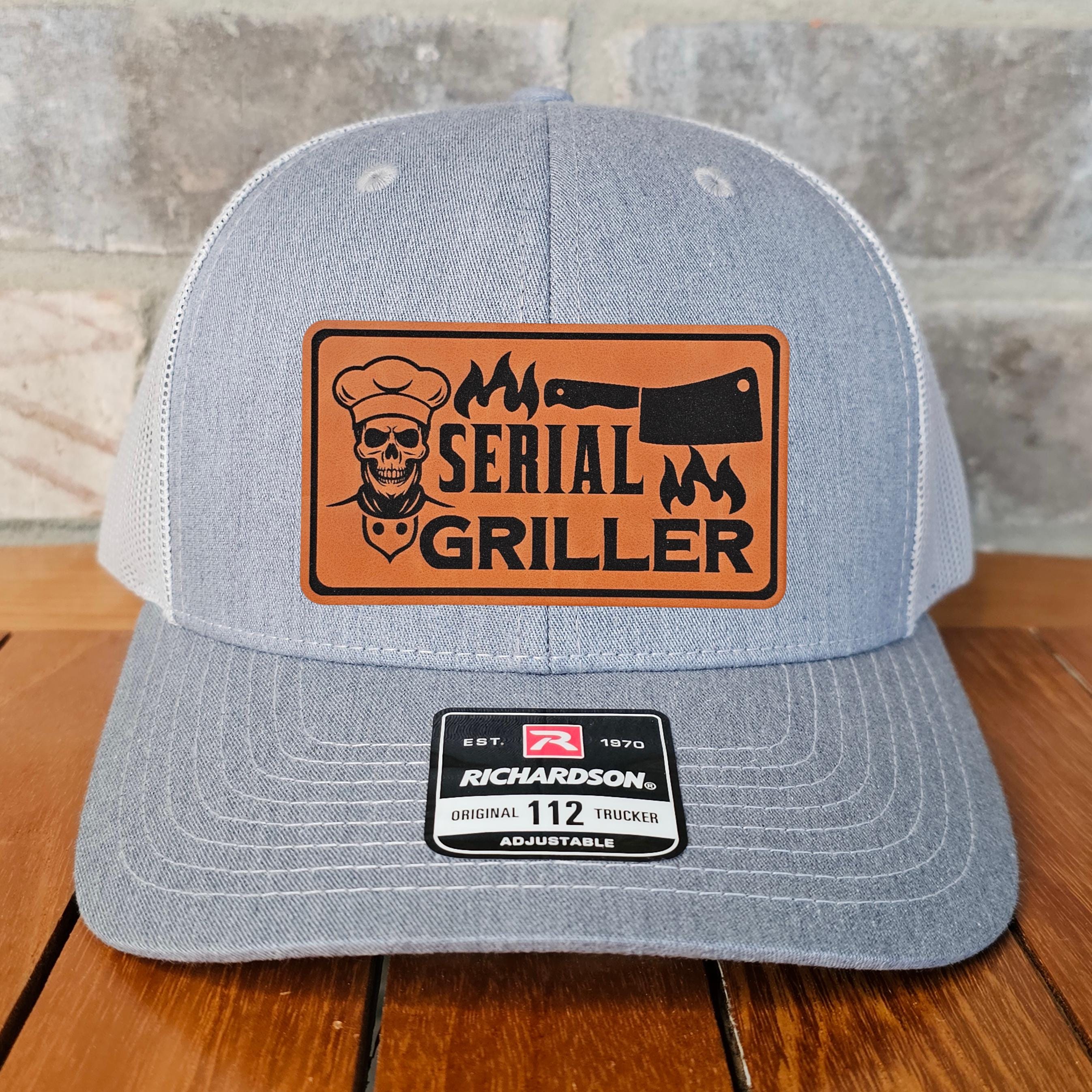 Griller Leather Patch Trucker Hat, Richardson 112, BBQ Bar B Q Cap, Funny Hat, Cookout Lover Hat, Dad Gift, Skull, Laser Engraved