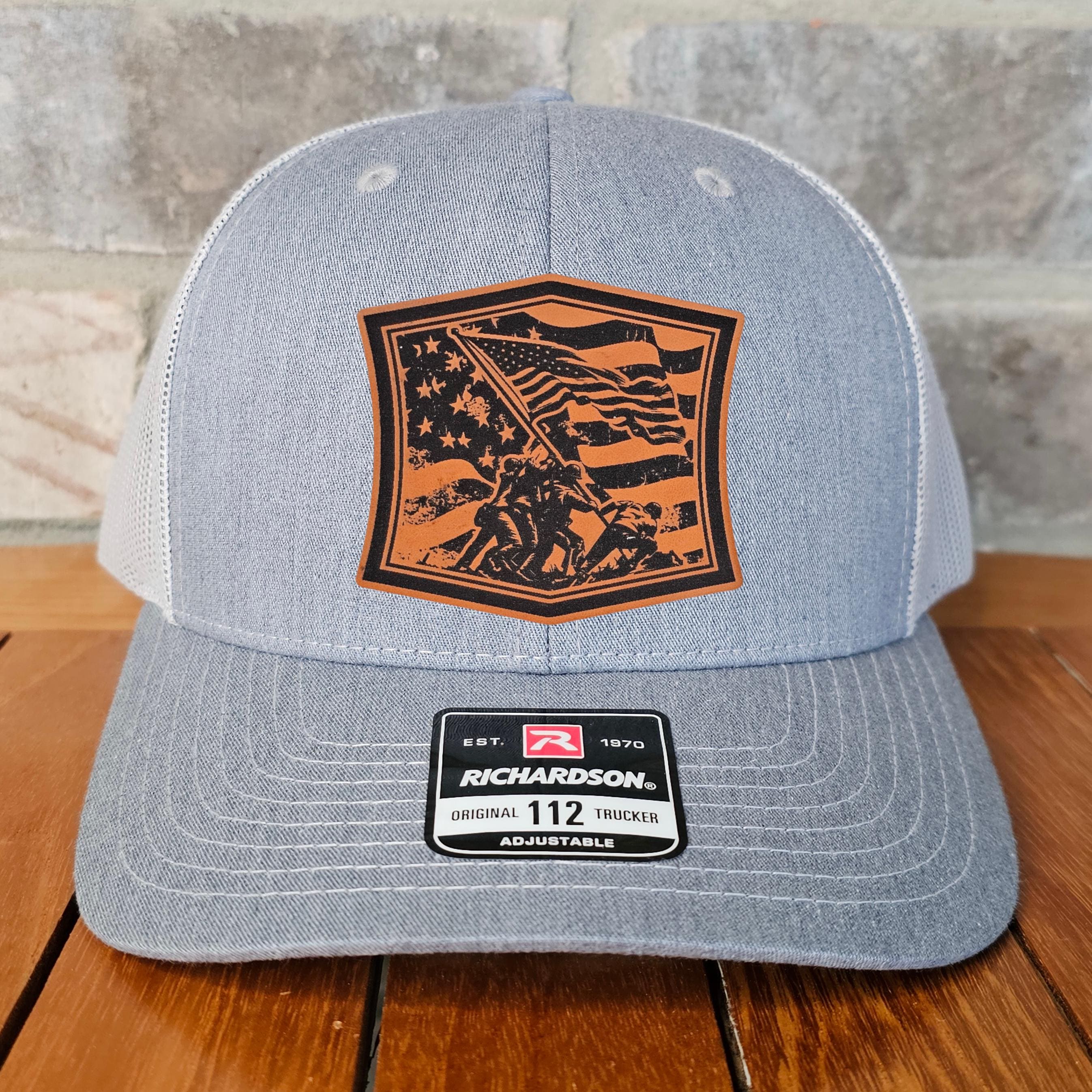 Iwo Jima Leather Patch Trucker Hat with Flag, Richardson 112, Military Gift, Marine Dad Gift, Husband Gift, Veteran Hat, Laser Engraved