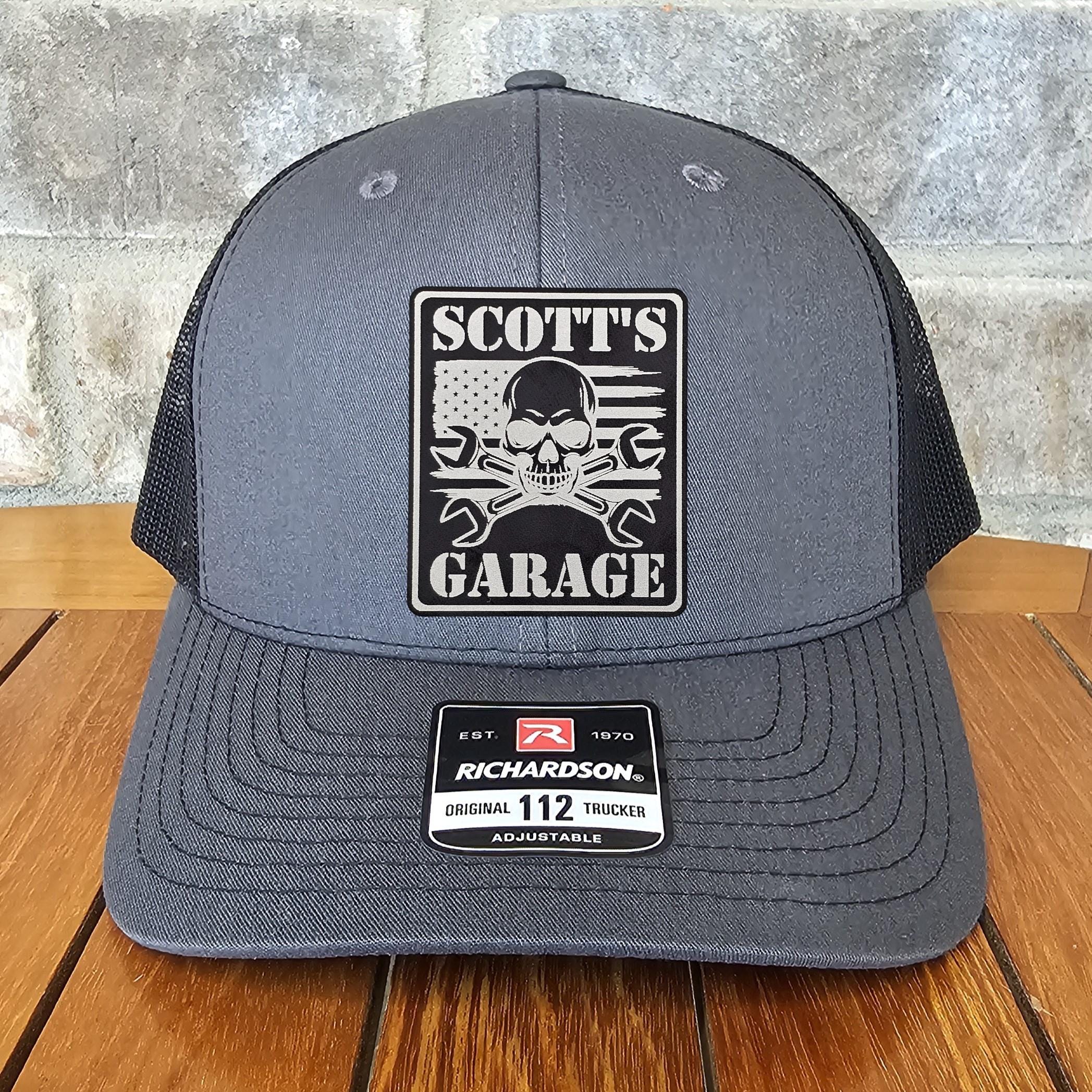 Mechanics Leather Patch Trucker Hat, Richardson 112, Personalized Shop Cap, Work Hat, Garage Hat Name, Dad Gift, Skull, Laser Engraved