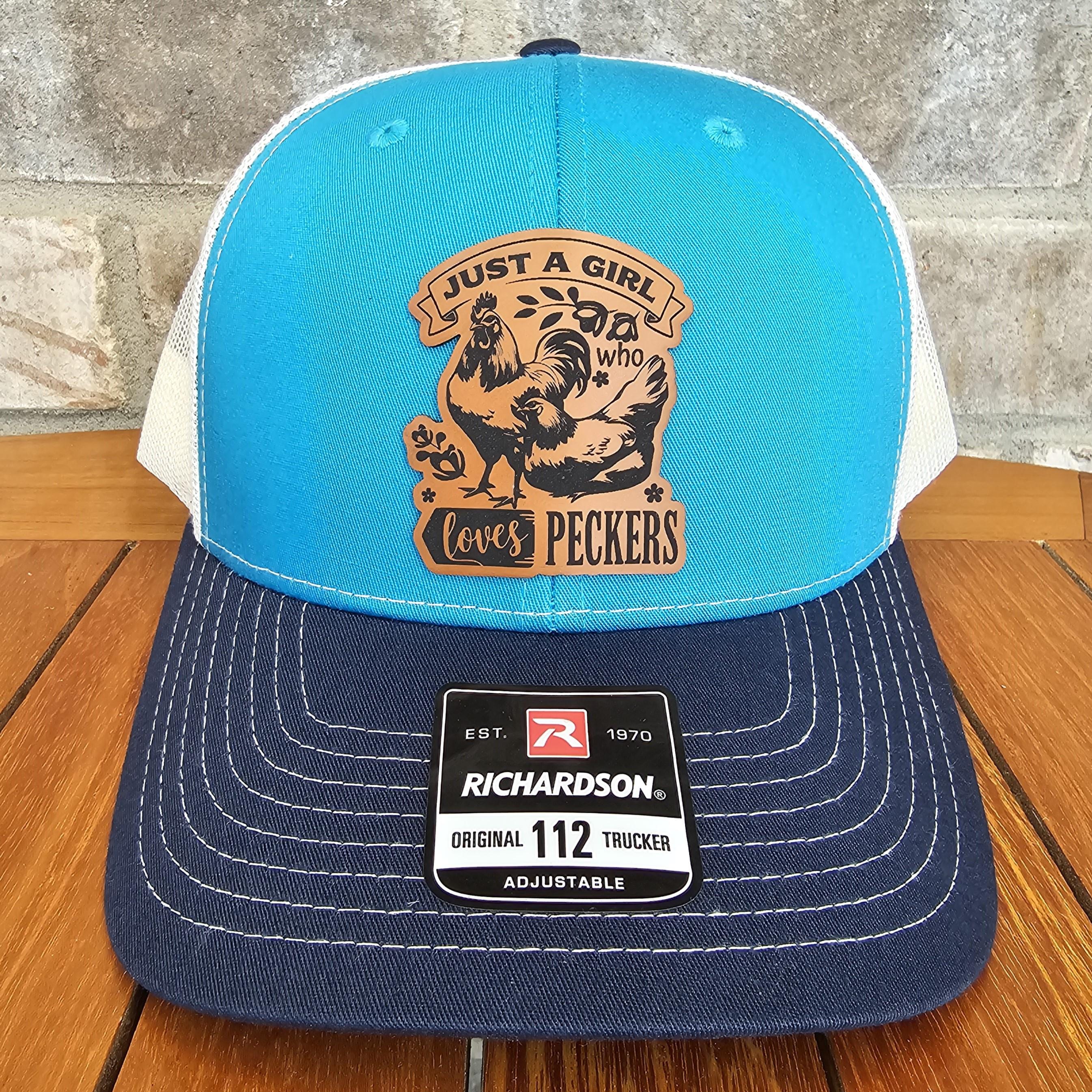 Chicken Leather Patch Trucker Hat, Richardson 112, Just a Girl Loves Peckers Cap, Funny Hat, Chicken Lover Hat, Farmer Gift, Laser Engraved