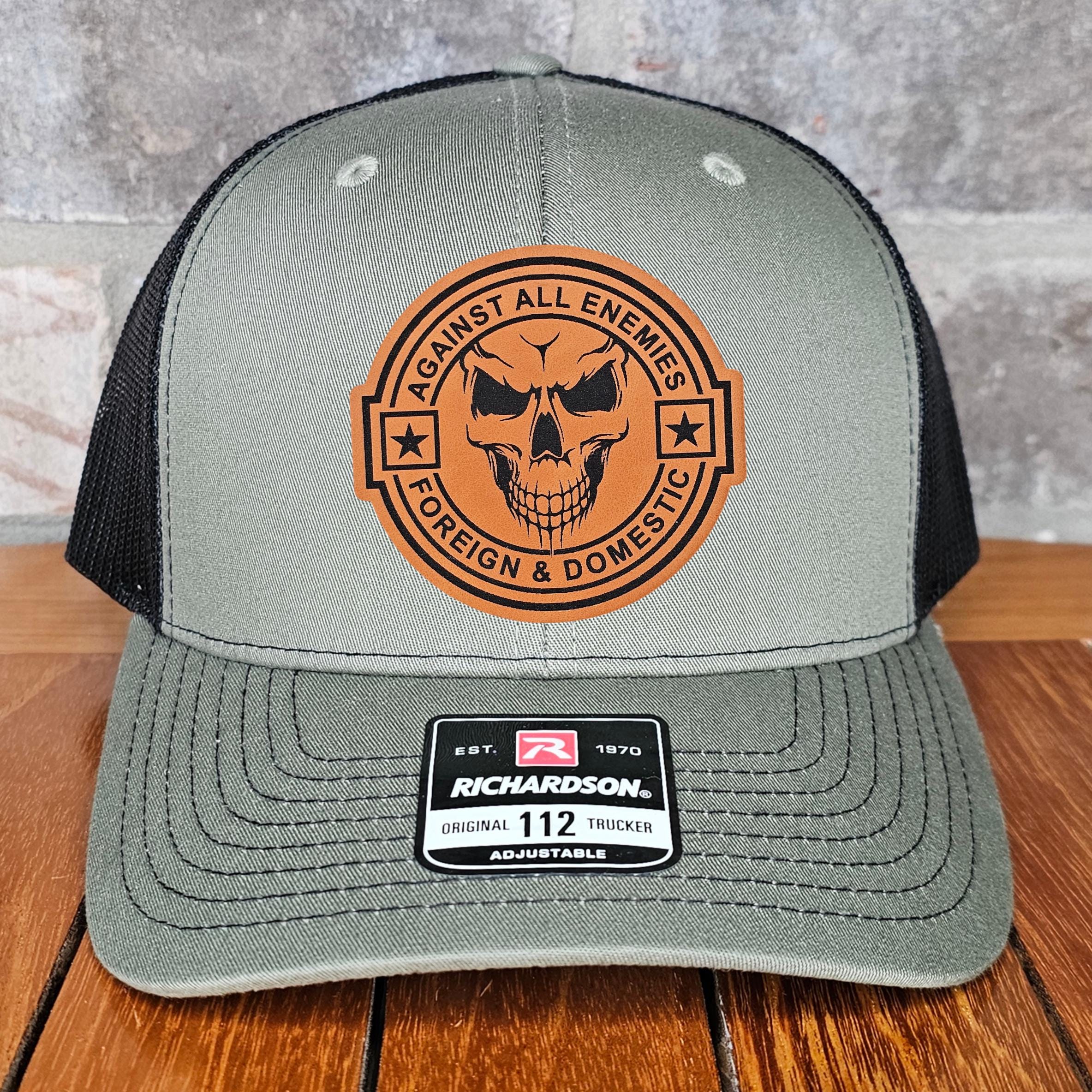 Veteran Leather Patch Trucker Hat, Against All Enemies Skull, Richardson 112, US Army Hat, Military Gift, Dad Gift, Army Cap, Laser Engraved