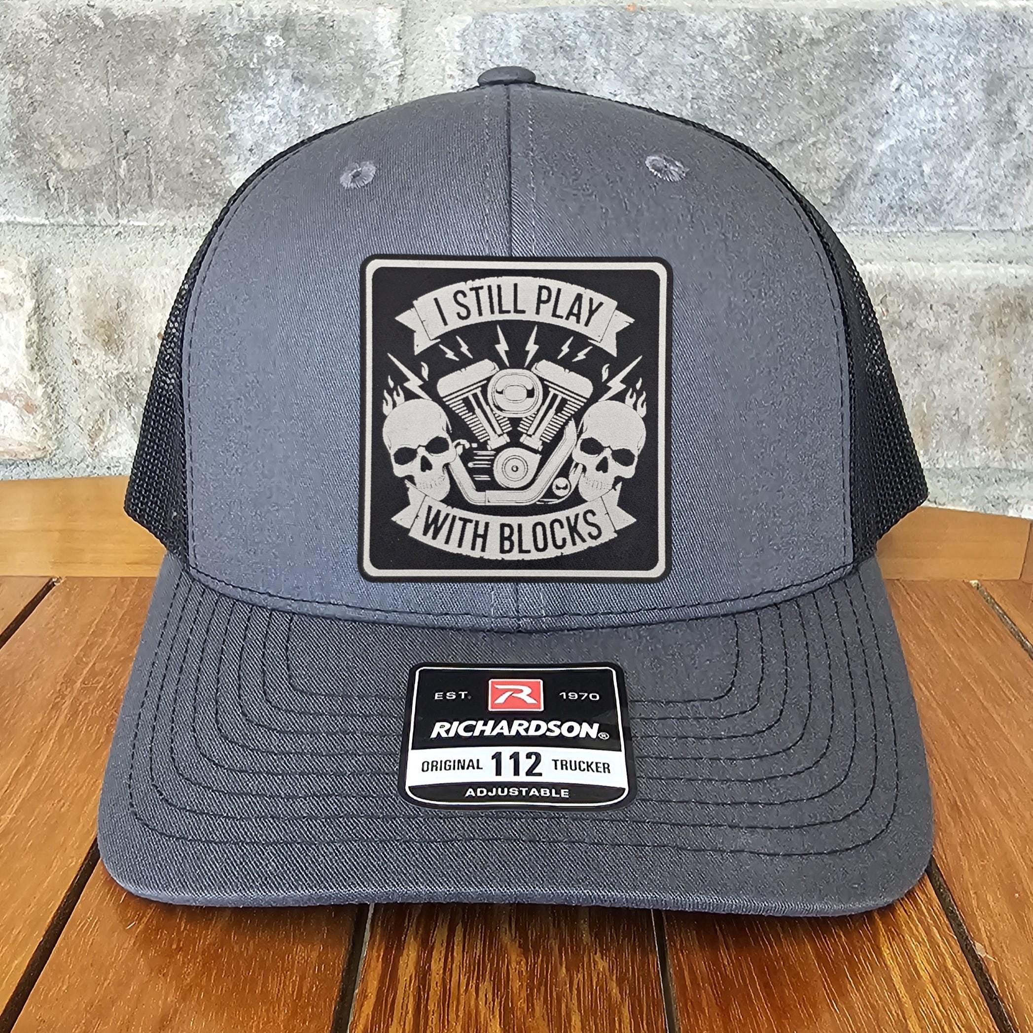 Motorcycle Mechanics Leather Patch Trucker Hat, Richardson 112, I Play with Blocks, Funny V Twin Cap, Work Hat, Dad Gift, Laser Engraved