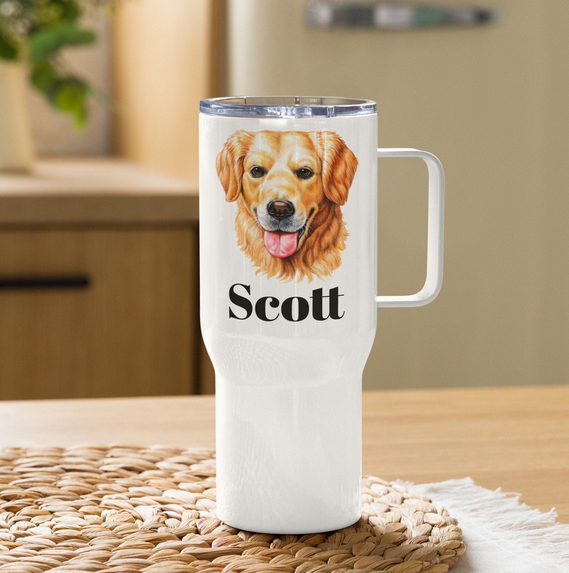 Custom Golden Retriever Dog Travel Mug Tumbler with Handle, Stainless Steel BPA-free plastic Cup, 25 Ounce Mug, Dad Mom Dog Lover Gift