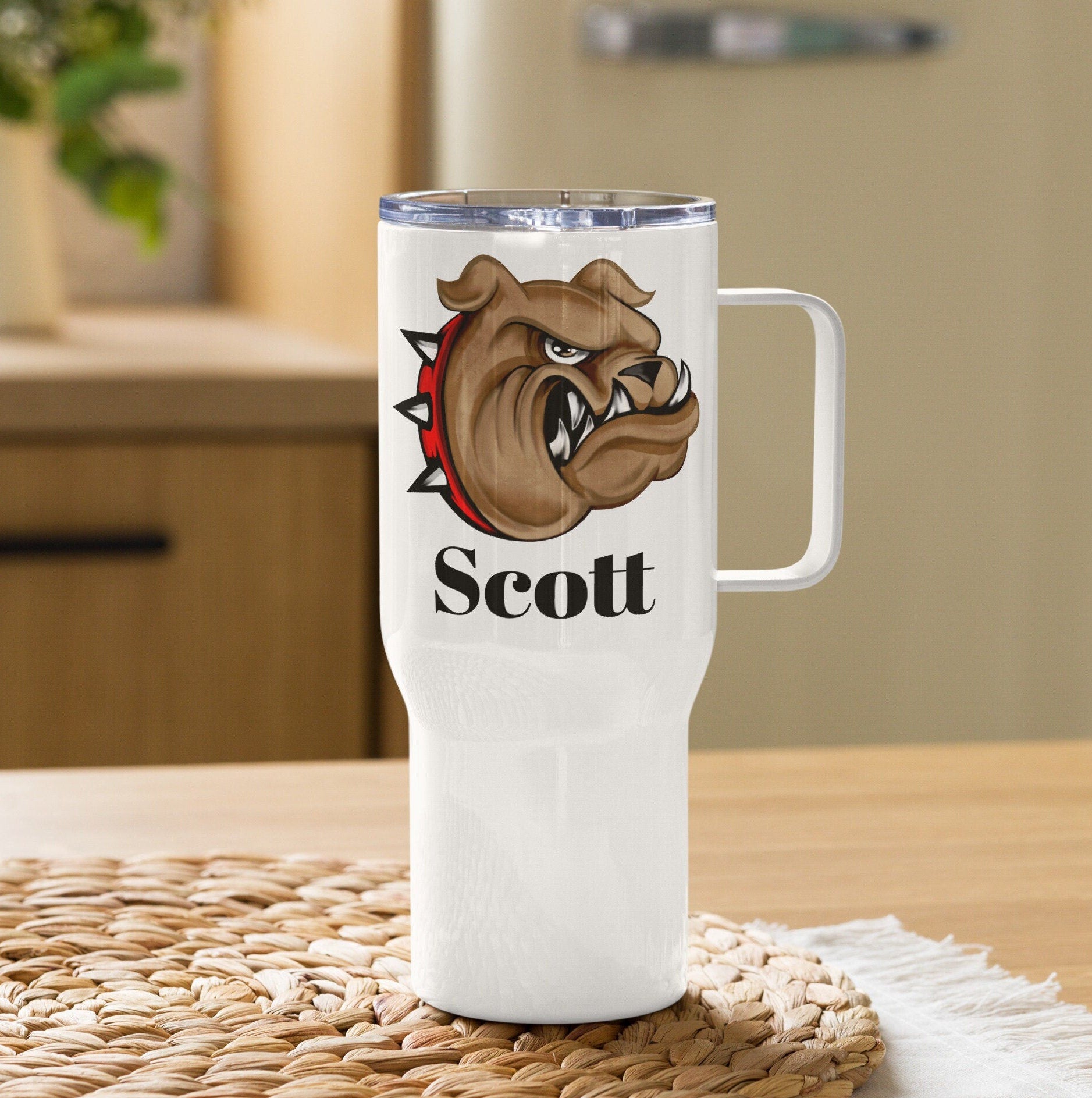 Custom Angry Bulldog Dog Travel Mug Tumbler with Handle, Stainless Steel BPA-free plastic Cup, 25 Ounce Mug, Dad Mom Dog Lover Gift