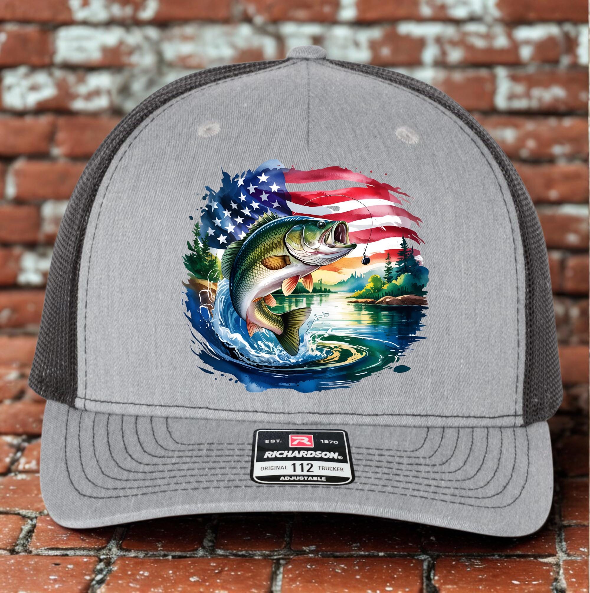 Bass Fishing Trucker Hat, Patriotic Fishing Hat Design, Richardson 112, Fly fishing Dad Gift Husband Gift, Sportsman Gift, Printed Hat