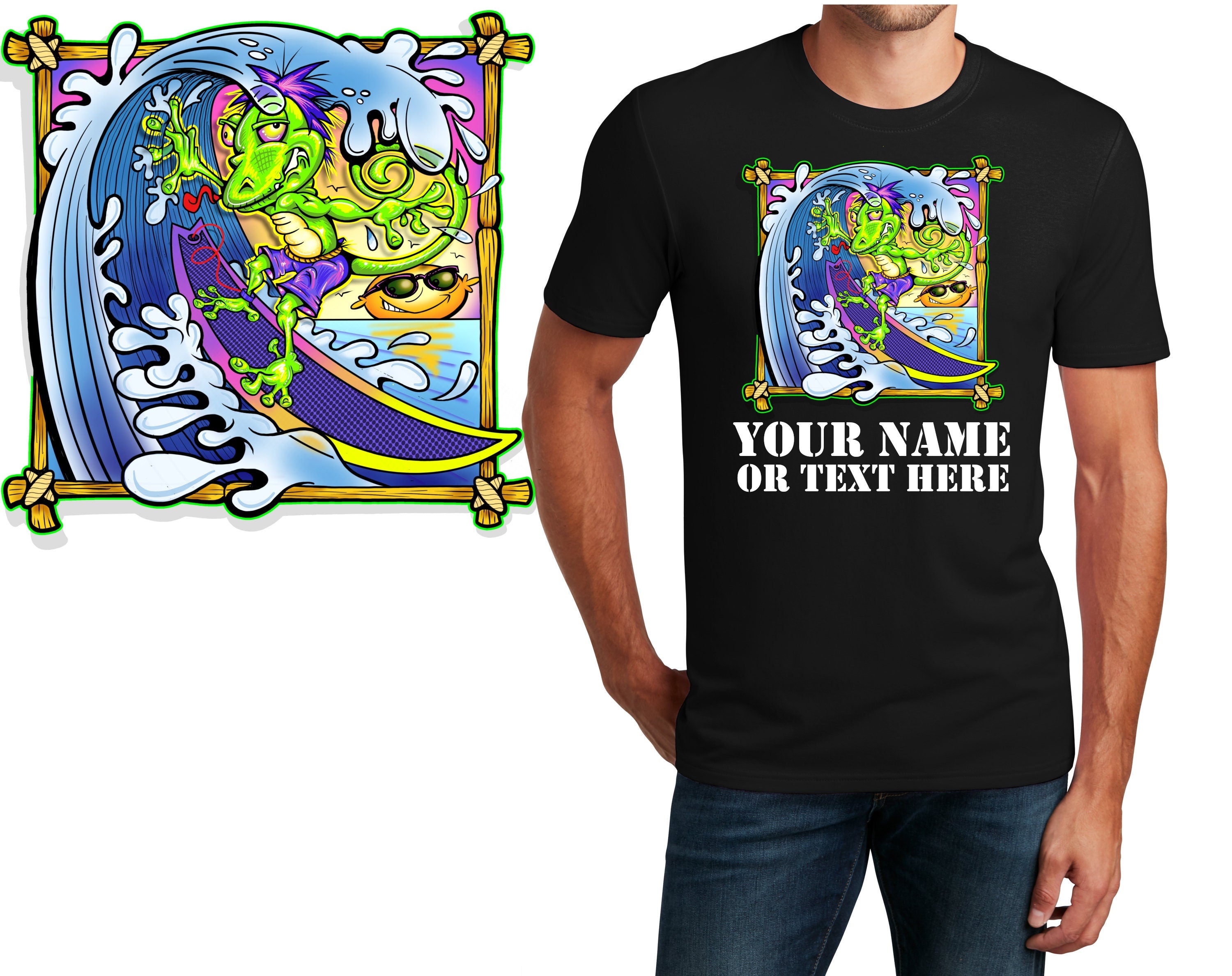 Personalized T-Shirt Gecko Surfing Design, Sports Shirt, Custom Printed Shirt, Custom Name, Dad Gift, Coach Gift, Unisex, Womens Tee