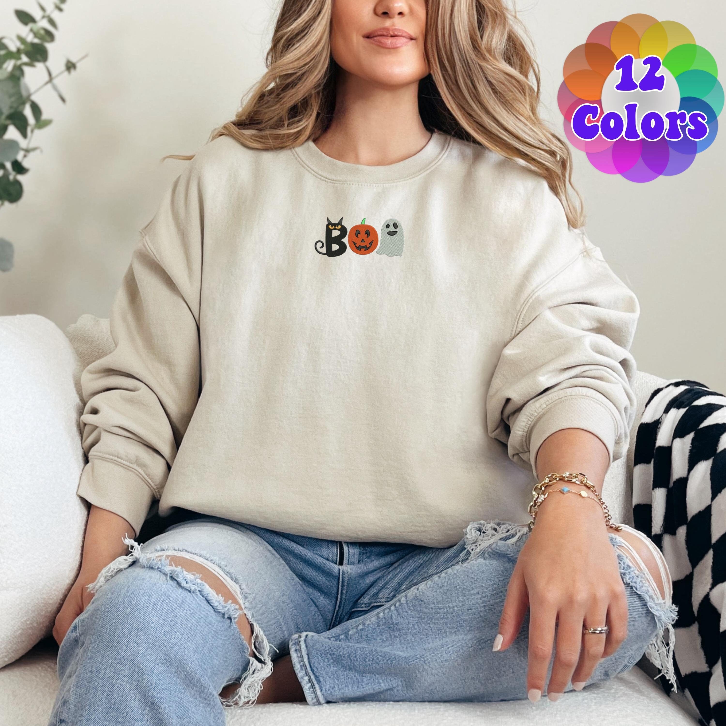 Embroidered Halloween Ghost Sweatshirt, Sweatshirt Boo Pumpkin Design and Name, Black Cat Sweatshirt, Mom Gift, , Womens Unisex