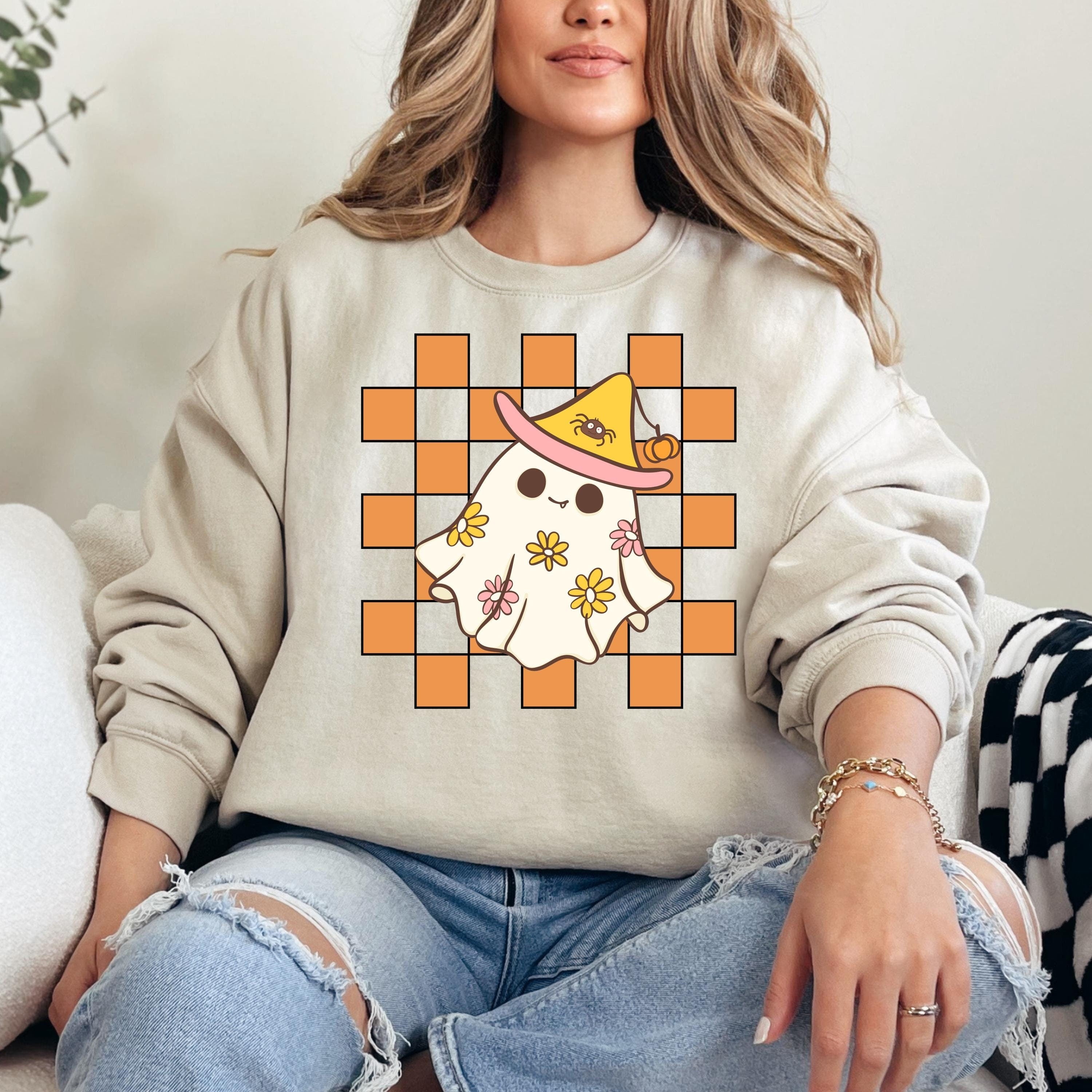 Halloween Ghost Sweatshirt, Cute Ghost Checker Flowers Sweats, Womens Halloween Sweatshirt, Cute Retro Fall Sweats, Spooky Season, Fall Gift