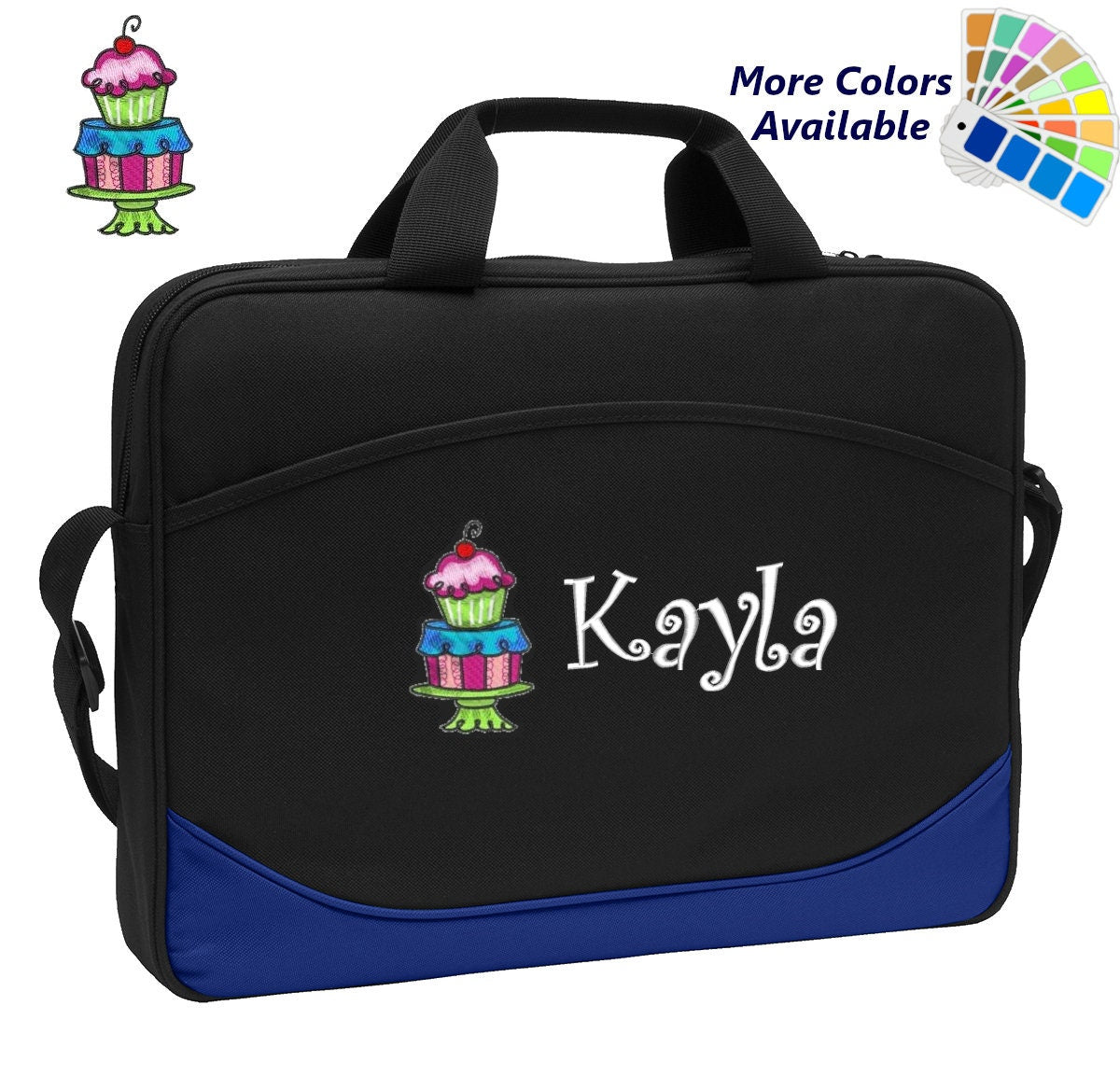 This Item includes: ► Canvas Computer Case in the Color of your choice ► Embroidered Name of Your Choice ► Cupcake Embroidery Design Measurements: 12" High x 15.5" Wide x 2.5" Deep Case Features: This classic, protective case is full of function with its zippered, padded main compartment and adjustable shoulder strap for easy transport. ► Adjustable Shoulder Strap ► 600 denier polyester canvas ► Web carrying handles ► Protective padding on sides and bottom ► Slip pocket on front panel ***************************************************** We do not accept returns on Embroidered items ***************************************************** MKABG305