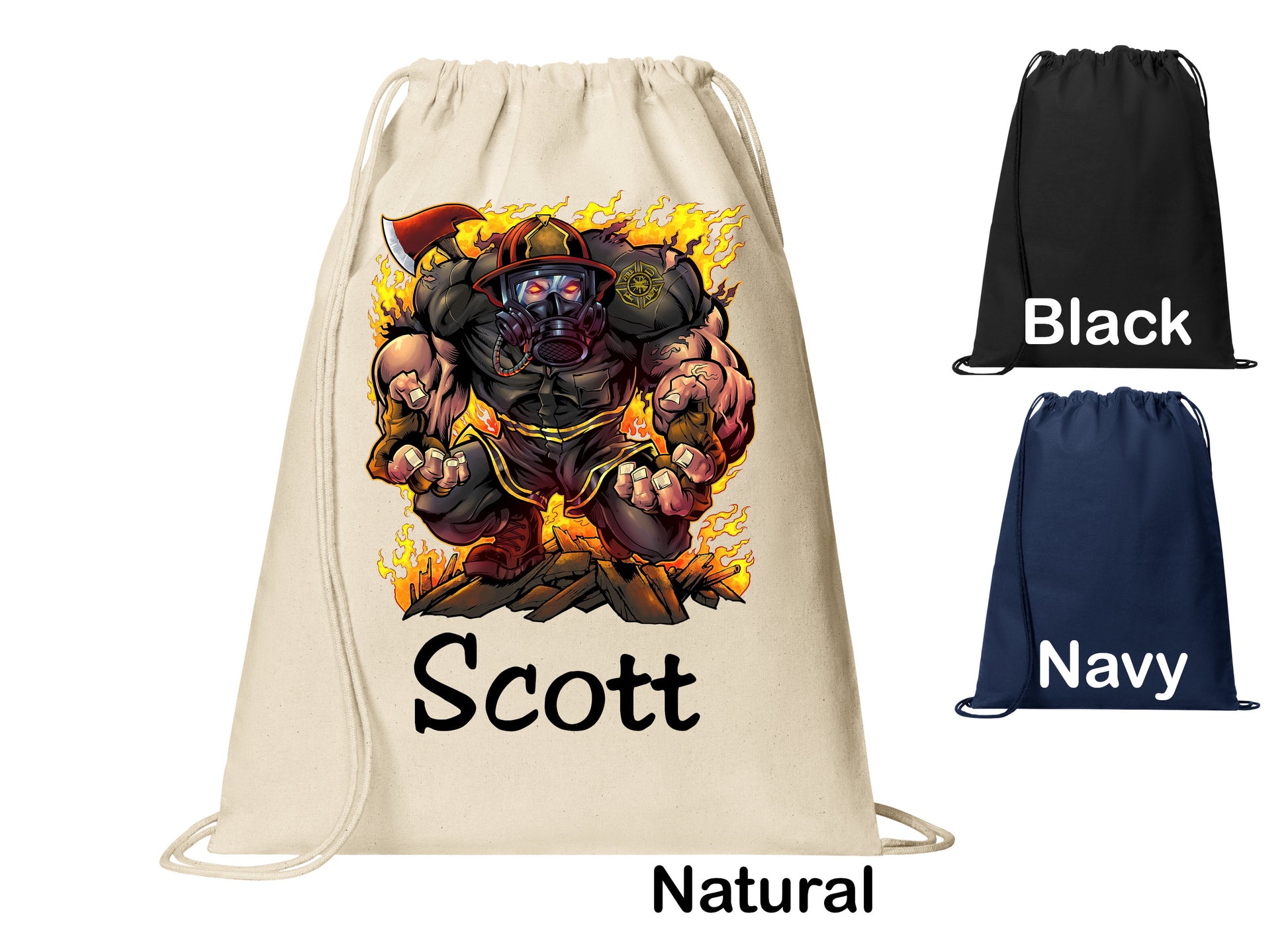 Personalized Firefighter Bodybuilder Cinch Pack, Drawstring Gym School Pool Backpack, Printed Monogrammed Custom Name, Perfect Gift